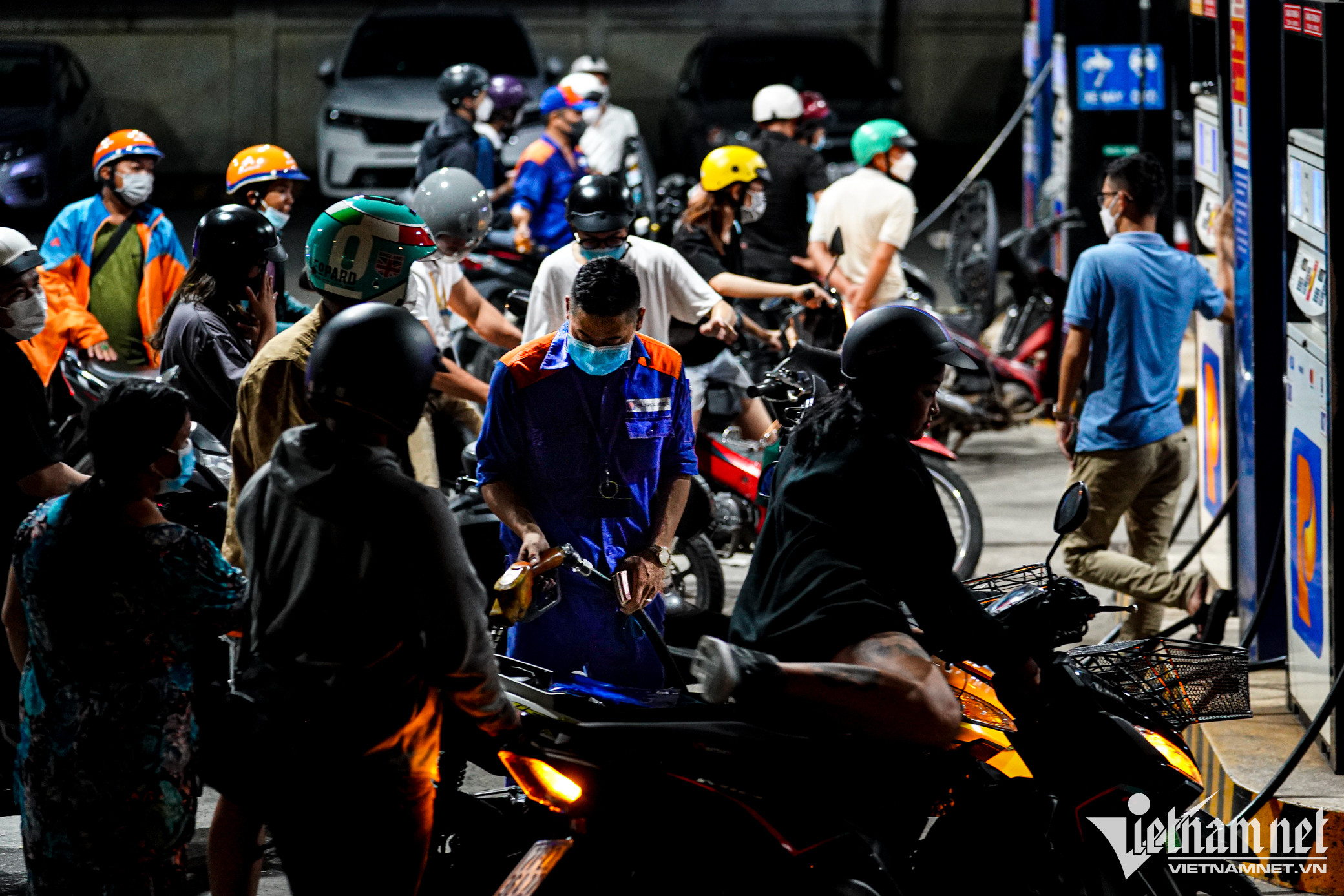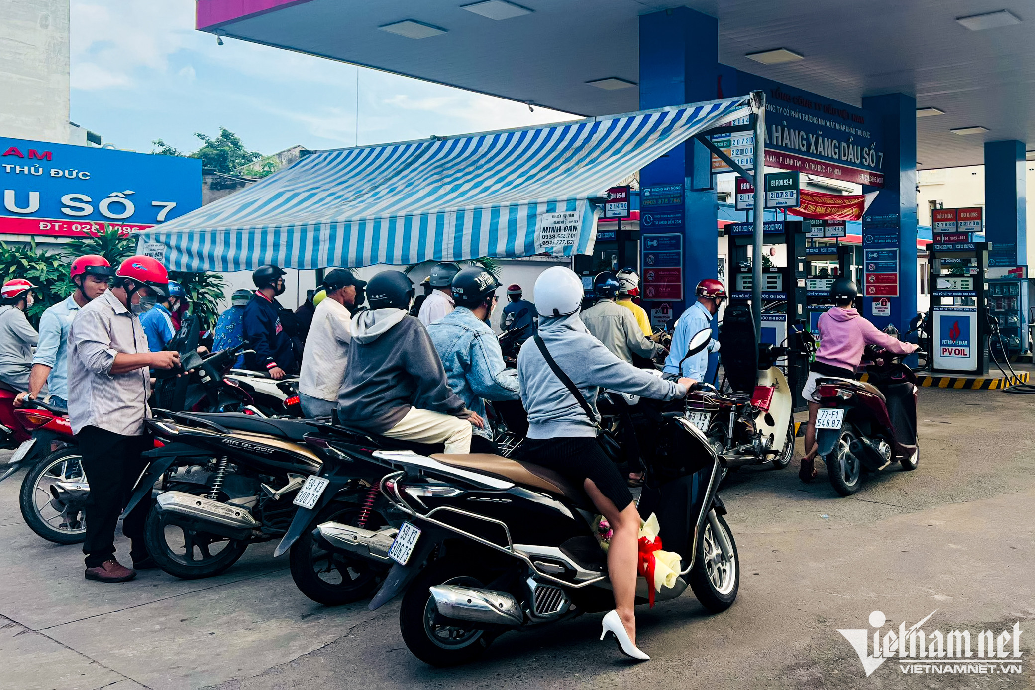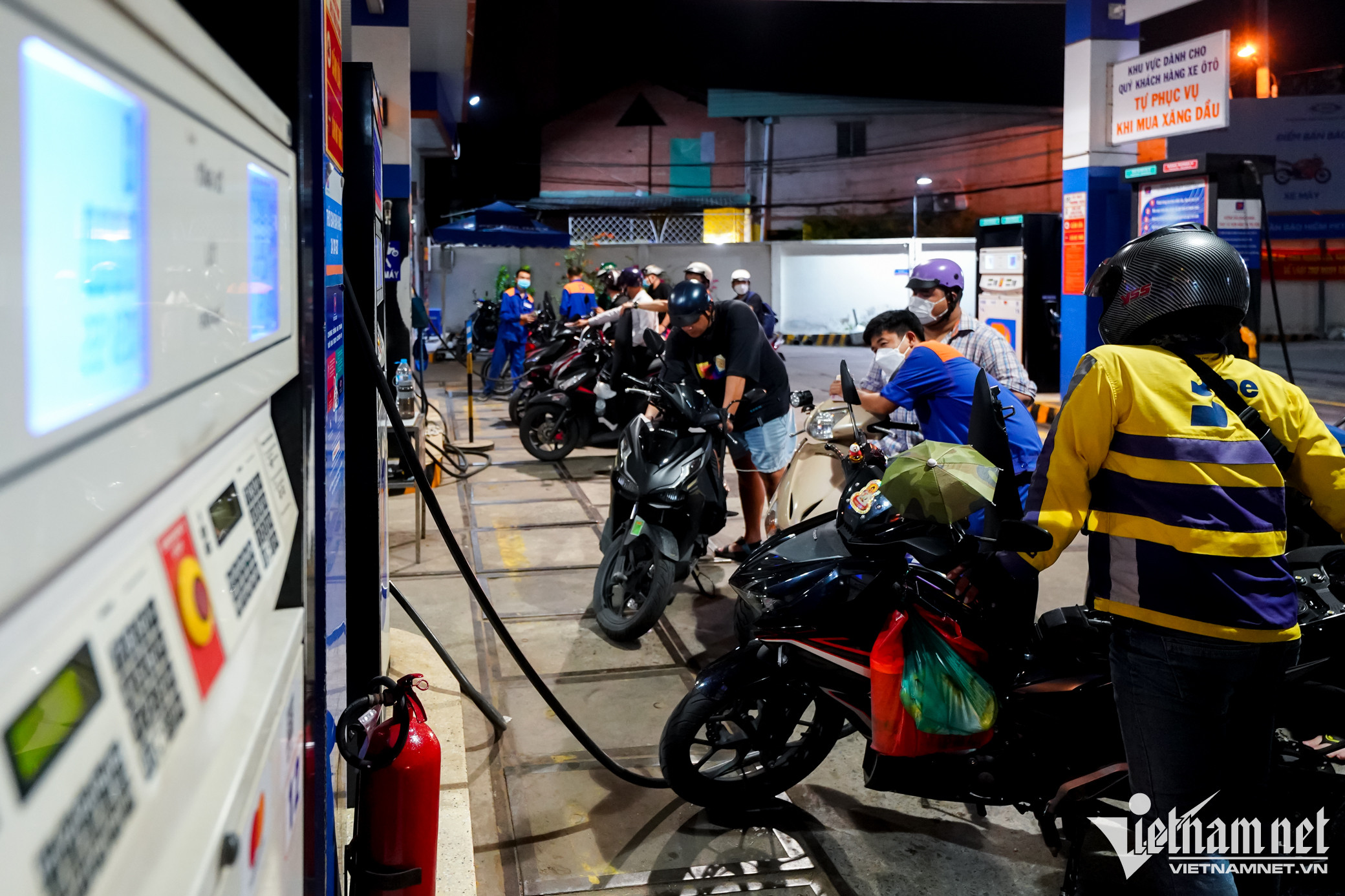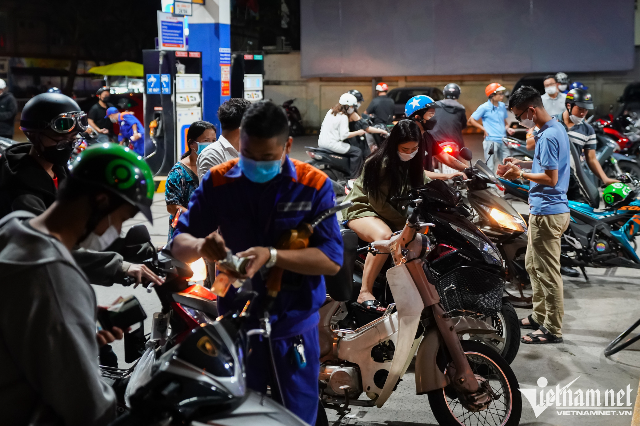 Tại cây xăng trên đường Trần Não (TP. Thủ Đức), xăng RON 95 được niêm yết với giá 22.120 đồng/lít. Khách tăng đột biến khiến lượng xăng bán ra cũng tăng cao.Một nhân viên tại cây xăng này cho biết từ sáng, lượng người đến đổ bắt đầu đông và kéo dài đến tận đêm. "Từ sáng đến tối tổng lượng xăng bán ra có thể đạt hơn 60.000 lít, tăng gấp đôi so với ngày thường", anh nói.Quản lý cửa hàng cho biết nhiều người đặt câu hỏi "ngày mai còn bán xăng không"? Để giải đáp thắc mắc và lo ngại của khách, người này khẳng định sẽ luôn có đủ xăng để bán và kêu gọi người dân không mua xăng trữ, gây mất an toàn và dễ cháy nổ.Đến 22h, lượng khách vẫn không giảm. Họ cho biết đây là lần đầu tiên thấy đông người đổ xăng vào khung giờ này.