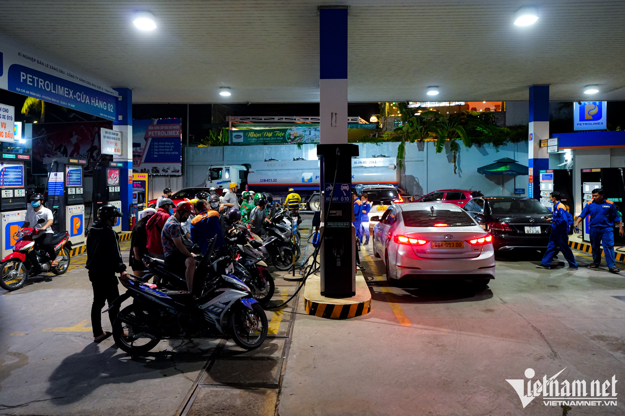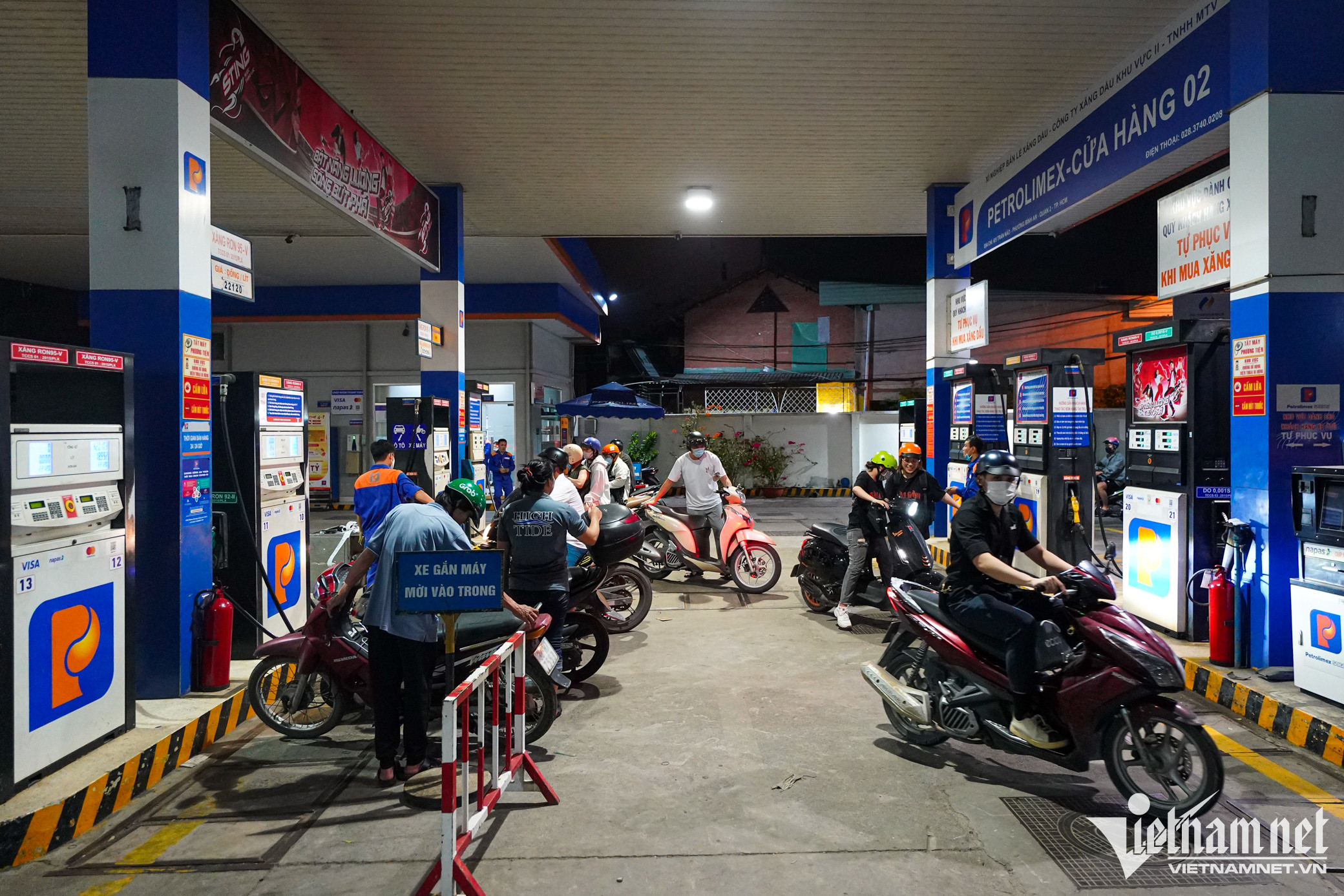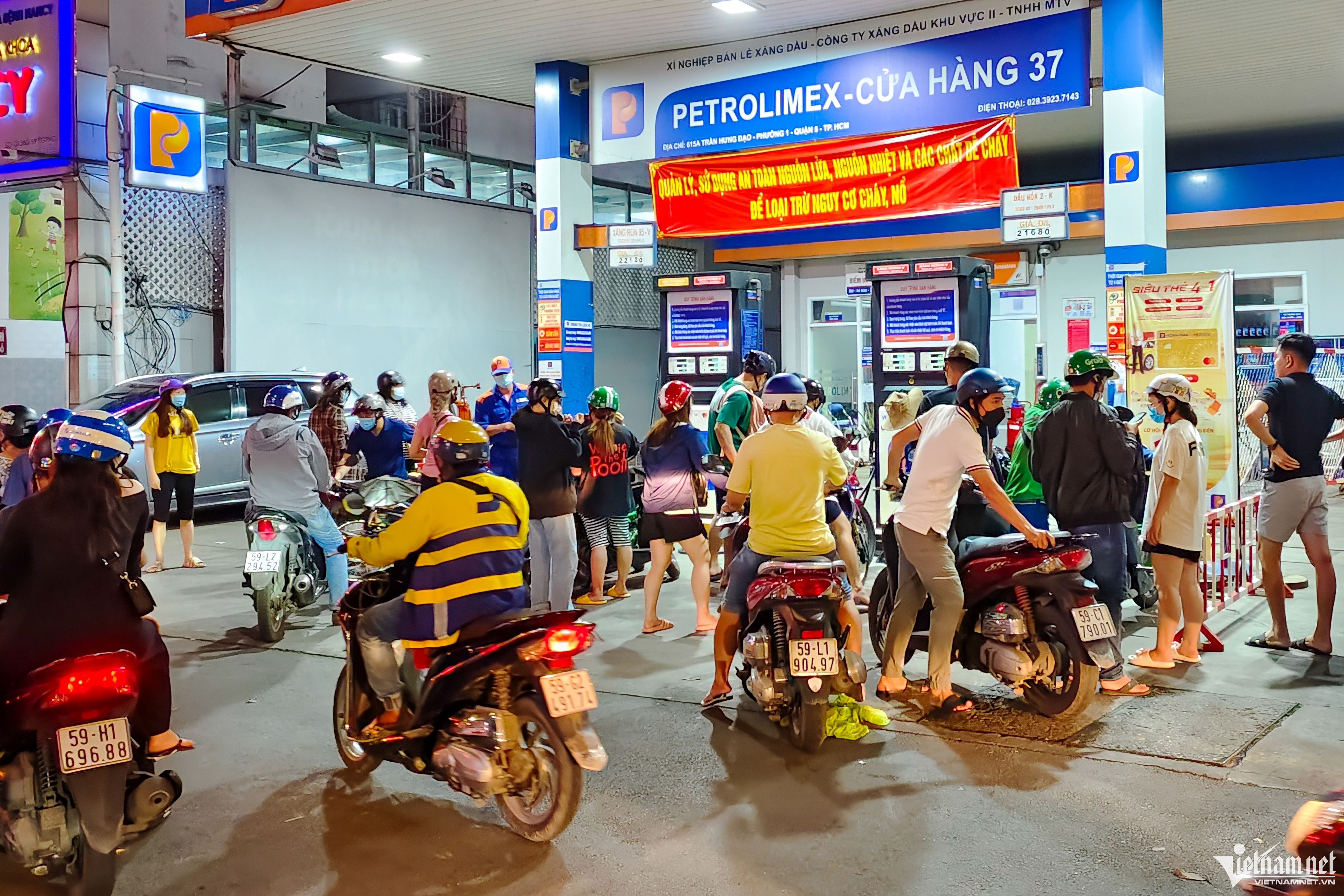 Tương tự, tại cây xăng trên đường Xô Viết Nghệ Tĩnh (quận Bình Thạnh) cũng rất đông khách. Cửa hàng này khẳng định chỉ đổ trực tiếp vào xe, không bán cho người mang theo chai, can nhựa để tích trữ.Cửa hàng này có 10 trụ bơm đều hoạt động hết công suất. Khách mua xăng ra vào liên tục khiến nhân viên không thể nhớ nổi người nào đến trước và đến sau, có lúc xảy ra tình trạng tranh giành lượt đổ theo thứ tự.Ghi nhận lúc 23h45, vẫn còn đông nghẹt người chen chúc nhau chờ được đổ xăng.Anh Văn Pháp Trí (32 tuổi, TP. Thủ Đức) làm taxi công nghệ cho hay, cả ngày nay anh tốn rất nhiều thời gian cho việc đổ xăng. Anh Trí đã đổ xăng 3 lần, nhưng mỗi lần anh phải kiếm hơn 10 cây xăng mới có chỗ để nạp nhiên liệu, nhưng rất hạn chế về số lượng có thể mua. Tương tự, một tài xế xe ôm công nghệ chia sẻ: "Vì 2 cây xăng gần đó hết hàng nên người dân kéo đến cây xăng Petrolimex mua cho thoải mái, chứ sáng giờ các điểm tôi ghé thường đóng cửa và giới hạn tôi đổ không quá 30.000 đồng. Trong khi đó, trung bình mỗi ngày tôi chạy hết 100.000 đồng tiền xăng".Anh Vũ Tùng Lâm, cửa hàng trưởng của cây xăng, cho biết từ sáng nay khách tăng đột biến, cửa hàng phải huy động nhân sự văn phòng vào hỗ trợ nhân viên bơm xăng. "Bản thân tôi cũng làm việc xuyên suốt, hiện tại là 0h rồi mà anh em vẫn chưa ăn uống gì", anh Lâm nói.Lúc nhập hàng là thời gian hiếm hoi nhân viên được rảnh để tranh thủ ăn tối. Theo Sở Công Thương TP.HCM, Petrolimex Sài Gòn đã huy động 80 xe bồn vận chuyển xăng dầu từ kho về nhập cho tất cả cửa hàng bán lẻ trong hệ thống, tăng cường nguồn cung bù đắp cho các cửa hàng lân cận đóng cửa hoặc bị gián đoạn nguồn cung cục bộ.