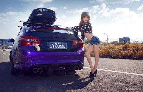 Người đẹp trẻ trung và gợi cảm trong trang phục áo chấm bi buộc cao và chiếc quần soóc denim khoe chân dài trắng mịn bên siêu xe màu tím.