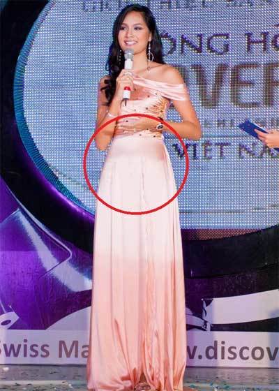 | Tư thế đứng khiến vòng bụng có chút nhô tròn bị lộ rõ hơn. |