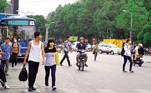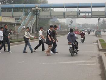 Băng qua đường ngay bên cạnh cầu vượt dành cho người đi bộ. Nhiều người trong số này là sinh viên.