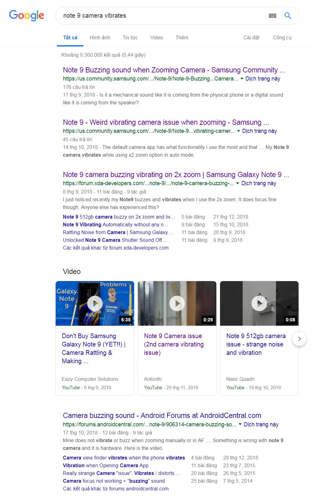 Nghi ngờ đây không phải tình trạng của riêng thị trường Việt Nam, chúng tôi có thử tìm kiếm trên Google thì nhận về rất nhiều kết quả tương tự. Ở top đầu tìm kiếm, các chủ đề thảo luận được tạo ra ngay từ tháng Chín, tháng Mười năm 2018, thu hút hàng trăm bình luận, nhiều người cho biết cũng gặp lỗi tương tự. Cho thấy người dùng Galaxy Note 9 trên thế giới đã sớm phải đối mặt với tình trạng này bởi máy được công bố vào tháng Tám năm ngoái, sau đó ít lâu thì phát hành ra thị trường. Tuy nhiên, phải đến thời gian gần đây người dùng trong nước mới chia sẻ nhiều về tình trạng lỗi camera tele. Ngoài ra, chúng tôi cũng chưa tìm thấy bài viết đề cập tình trạng này từ các báo công nghệ trong nước cho đến hiện tại.