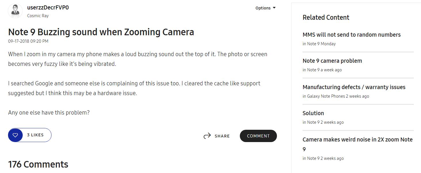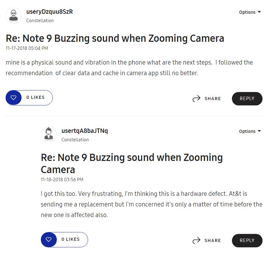 "Khi tôi zoom vào, camera tạo ra những tiếng ồn lớn. Bức ảnh hoặc màn hình trở nên nhòe khủng khiếp giống như nó đang rung lắc. Tôi đã tìm kiếm trên Google và có những người khác cũng phàn nàn tình trạng tương tự. Tôi đã dọn dẹp bộ nhớ cache phát sinh theo đề nghị hỗ trợ (của chính Mod diễn đàn) nhưng tôi nghĩ nó có thể là một vấn đề phần cứng". Thành viên này cho biết sau đó tình trạng lặp lại và Mod diễn đàn người dùng Samsung sau đó đã đề xuất anh ta gửi mã IMEI và model để giải quyết, nếu như không thể loại trừ nó kể cả khi đã truy cập vào Safe Mode.