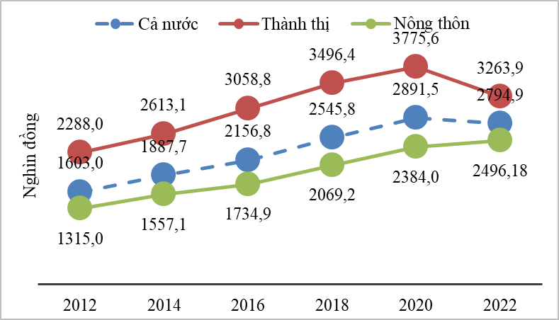 Trong khi đó, năm 2022 chi tiêu bình quân đầu người một tháng xấp xỉ 2,8 triệu đồng, giảm 3,3 điểm % so với 2020. Dưới tác động của dịch Covid-19 các hộ gia đình có xu hướng thắt chặt chi tiêu, đặc biệt là các hộ sống ở khu vực thành thị.