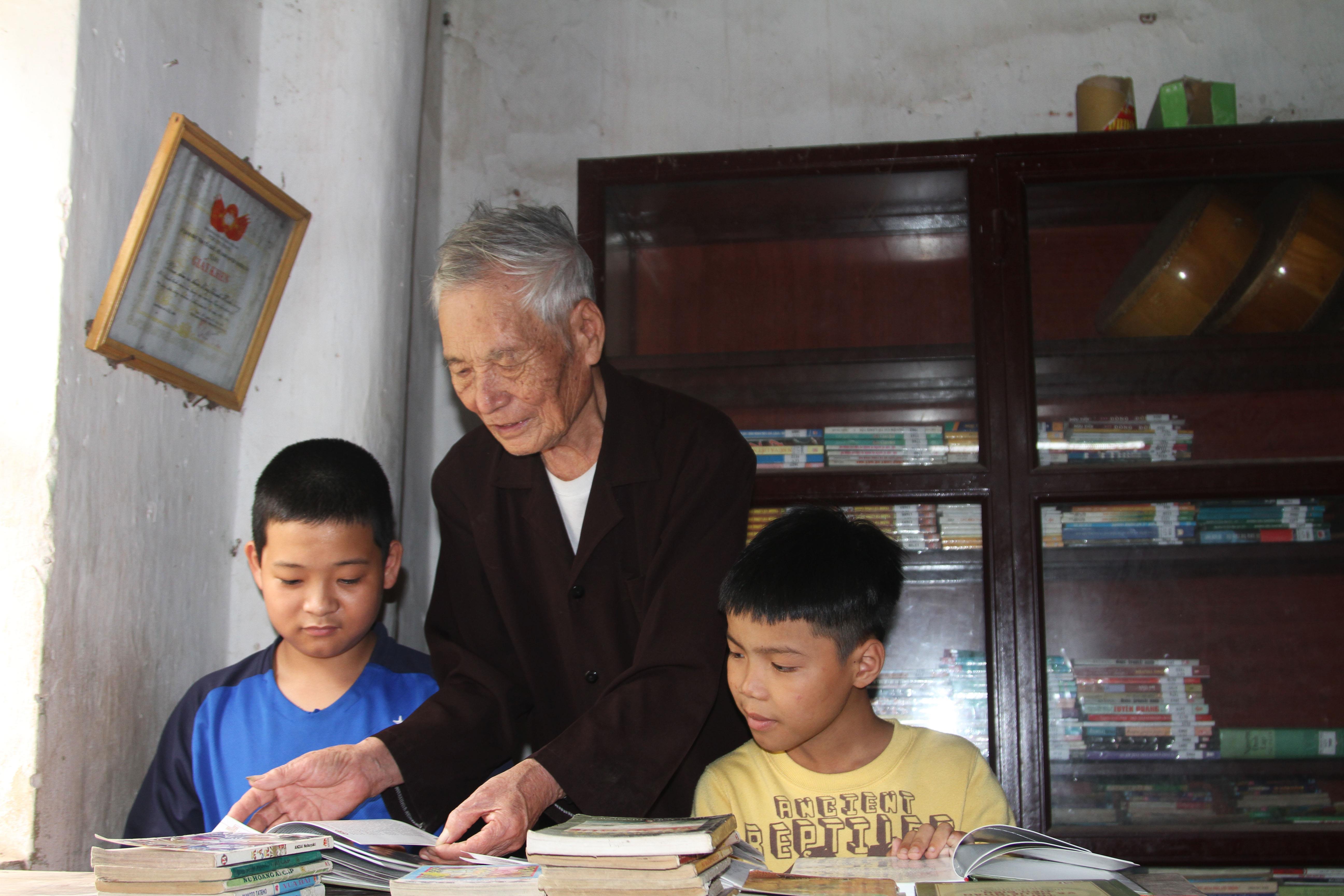 | Cụ Nguyễn Ngọc Giám hướng dẫn các cháu thiếu nhi trong thôn đọc sách. |