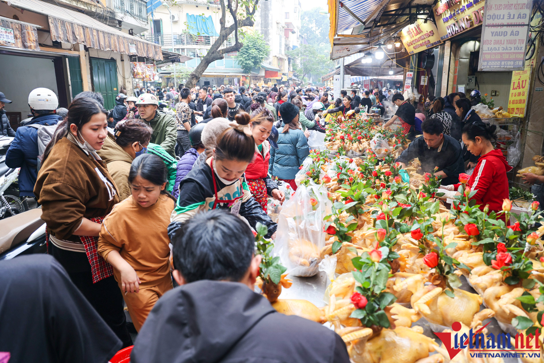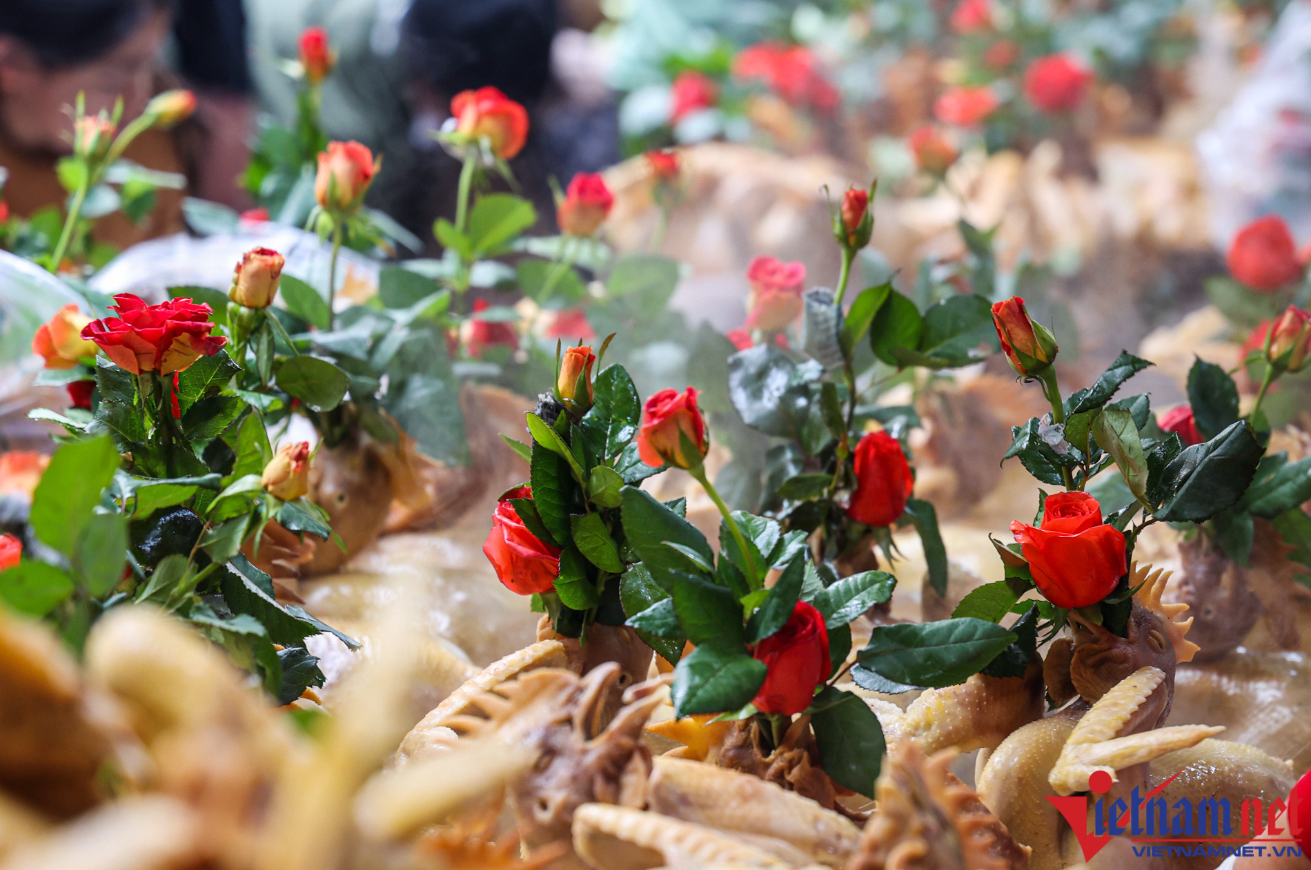 "Ngoài gà, cửa hàng còn bán chim quay, xôi gấc, canh măng, bóng mọc... phục vụ bà con ăn Tết. Gà bán ở đây là gà "tuyển" nên đắt hơn các chợ khác nên nhiều người vẫn xếp hàng để mua. Lúc cao điểm, gà lễ ngậm hoa hồng và xôi lớn có giá 800 nghìn đồng/cặp, trong khi ngày thường là 450-500 nghìn đồng/cặp", chị Hoàng Dung cho hay.