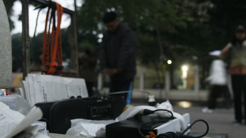 | Các cụ vẫn chỉn chu mang theo cả loa đài phục vụ cho việc tập thể dục |