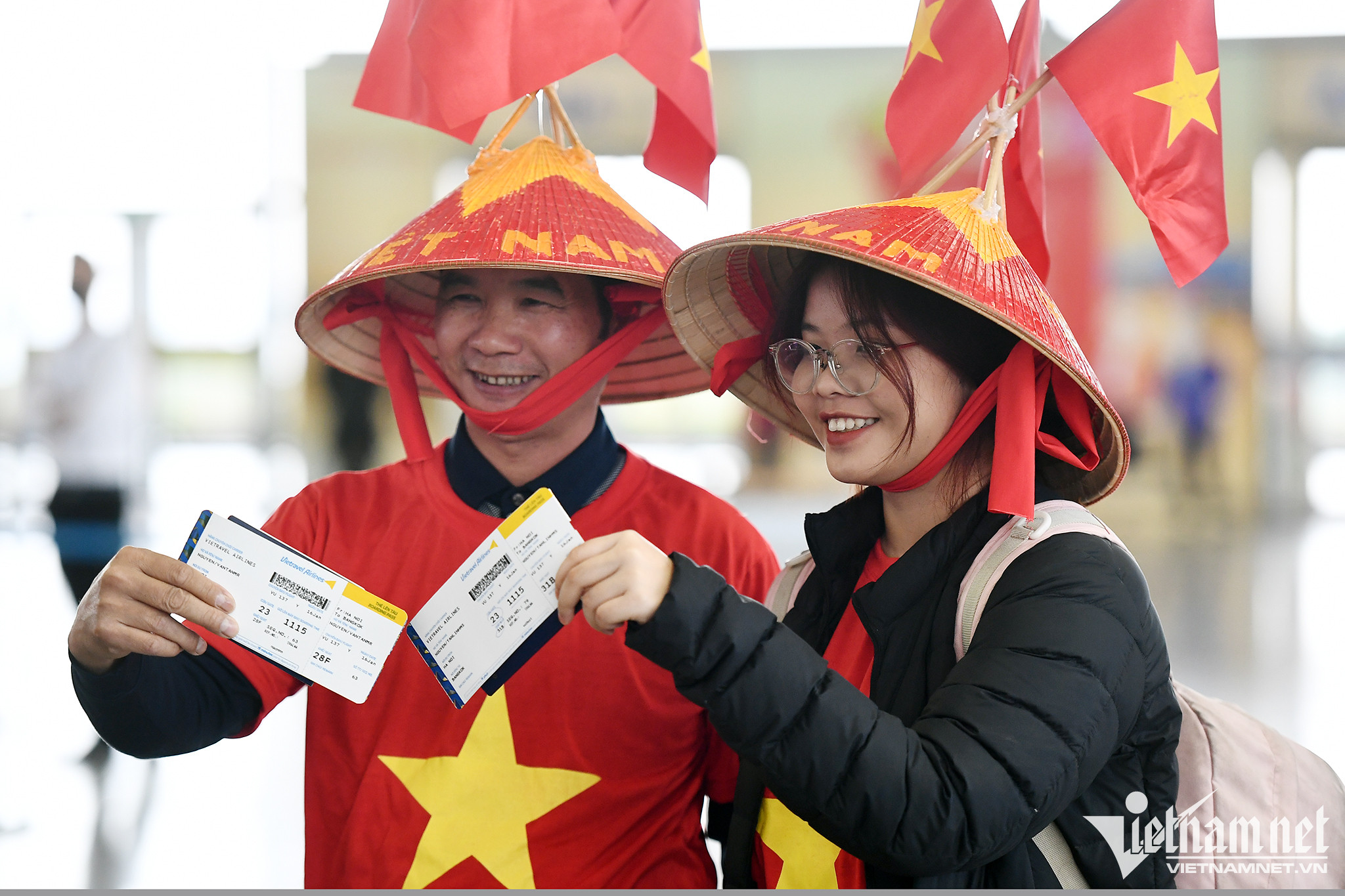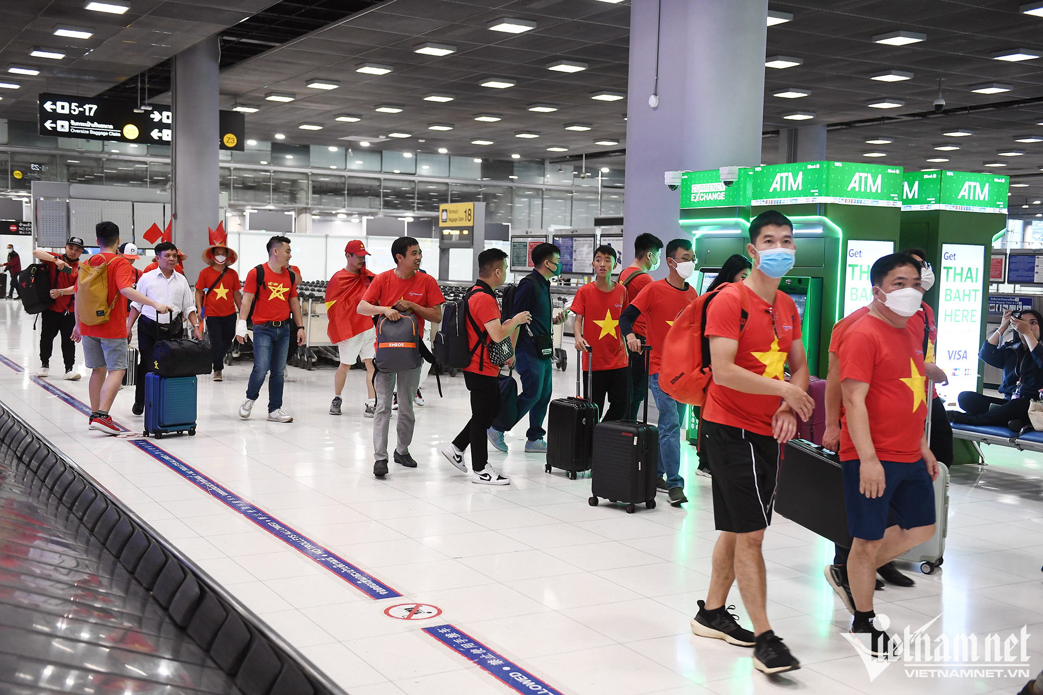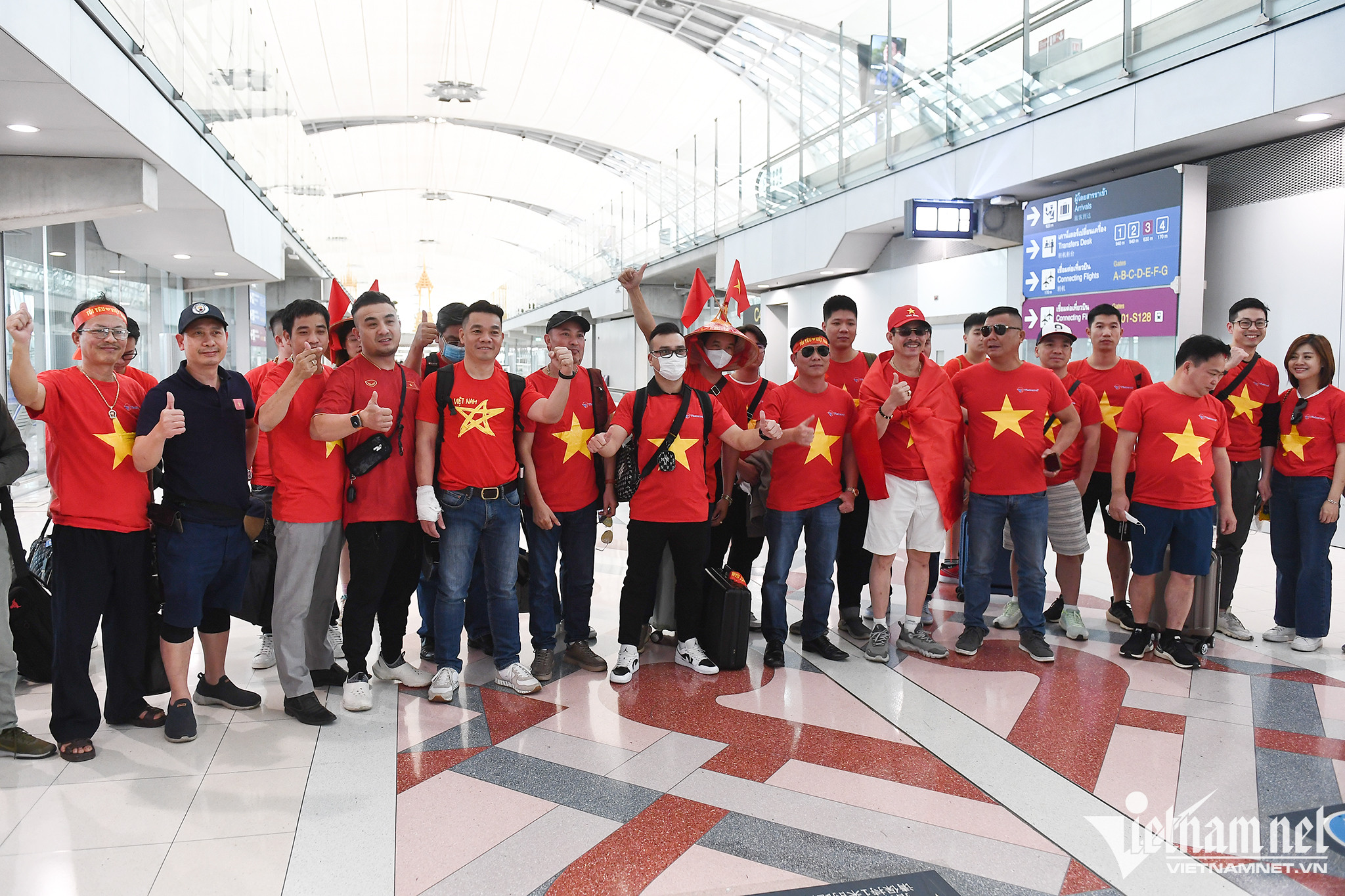 10h sáng 16/1, nửa ngày trước khi trận đấu quyết định chức vô địch AFF Cup diễn ra, nhà ga T2 sân bay Nội Bài (Hà Nội) xuất hiện nhiều hành khách mặc áo cờ đỏ sao vàng.Trong số này phần lớn là các CĐV trung thành của bóng đá Việt Nam. Có người chưa bỏ bất kỳ một trận đấu nào dù các học trò của HLV Park đá bóng ở trong hay ngoài nước.Anh Nguyễn Văn Tấn và con gái Nguyễn Tấn Linh hào hứng trước giờ khởi hành. Anh cho biết, năm 2019 từng bay đi Philipiines xem trận chung kết giữa U23 Việt Nam và U23 Indonesia và được tận mắt chứng kiến đội nhà giành huy chương vàng. Đây là lần thứ 2 anh sang nước ngoài cổ vũ thầy trò Park Hang-seo. "Mặc dù khó khăn nhưng tôi tin rằng tối nay tuyển Việt Nam sẽ thắng Thái Lan 1-0 giành chức vô địch", anh Tấn nhận định.Trên đường ra cửa máy bay, gặp một thầy đồ viết thư pháp, ông Phạm Văn Thức đã xin chữ "Việt Nam vô địch" để mang tới khán đài sân vận động Thammasat (Bangkok) treo lên. Còn ông Phạm Văn Thức đã theo đội tuyển ở tất cả trận đấu trong và ngoài nước. Mấy chục năm qua đi đâu cổ vũ ông cũng mang tấm ảnh Chủ tịch Hồ Chí Minh với ý nghĩa có Bác là giành thắng lợi. Vợ ông, bà Lê Thị Hồng An lần này cũng đồng hành cùng chồng. Hai ông bà làm nghề tự do, có 4 người con đều học tập và định cư ở nước ngoài nên gia đình có điều kiện cả về vật chất và thời gian dành cho trái bóng tròn. Đại diện đơn vị tổ chức du lịch Vietravel cho biết, trong hai này 15 và 16/1 có tổng cộng khoảng 150 khách là người hâm mộ bóng đá đặt tour đi xem. Giá mỗi người là 6,5 triệu đồng từ Hà Nội và 13 triệu đồng từ TP.HCM. Nếu chỉ đi máy bay và ở khách sạn, một CĐV chỉ phải chi 4 triệu đồng cho tour hai ngày một đêm.Vào lúc 13h30, đoàn CĐV đáp xuống sân bay Suvarnabhumi, Bangkok và sau đó di chuyển về sân vận động Thammasat.Vào lúc 19h30 tối nay, tuyển Việt Nam làm khách trên đất Thái. Nếu thắng với tỷ số 1-0, thầy trò Park Hang-seo sẽ giành chức vô địch AFF Cup 2022.