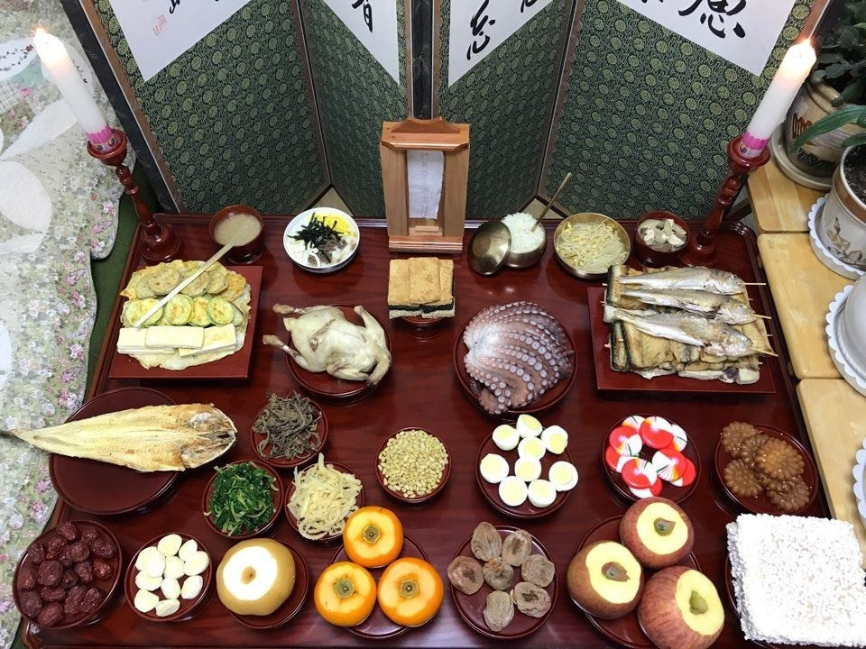 Tại Hàn Quốc, mâm thức ăn cúng thường gồm nhiều món, chuẩn bị cầu kỳ nên tốn không ít công sức. Ngoài hoa quả, canh bánh gạo, mâm cúng không thể thiếu rau củ chiên, thịt bò, cá, rau rừng, miến trộn...