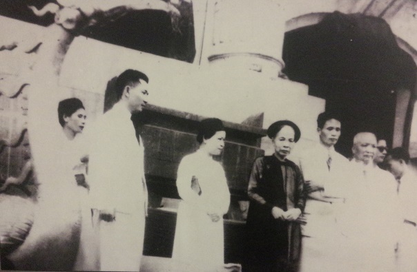 | Vợ chồng doanh nhân Trịnh Văn Bô cùng mẹ tham dự "Tuần lễ vàng" năm 1945. Ảnh: Gia đình cung cấp |