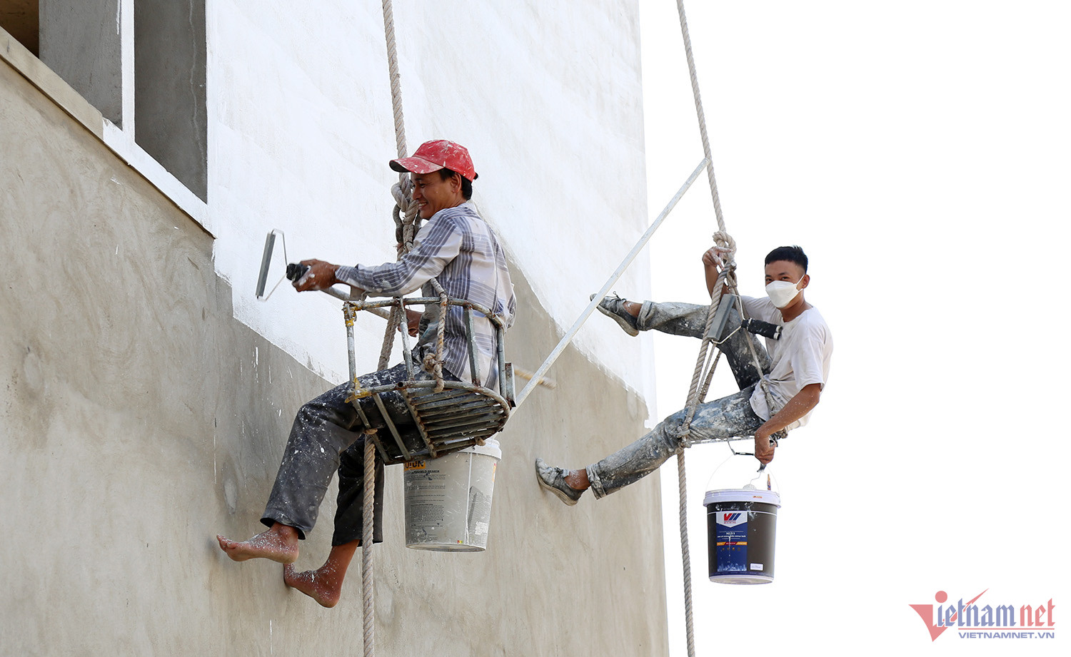 Cạnh một ngôi nhà đang hoàn thiện là nhóm thợ hàn, thợ xây dựng trùm kín đầu làm việc. Thời tiết một lúc ngày càng oi bức, nhóm thợ hàn sắt treo lên cao làm việc khoảng hơn 20 phút lại phải leo xuống ngồi nghỉ.
