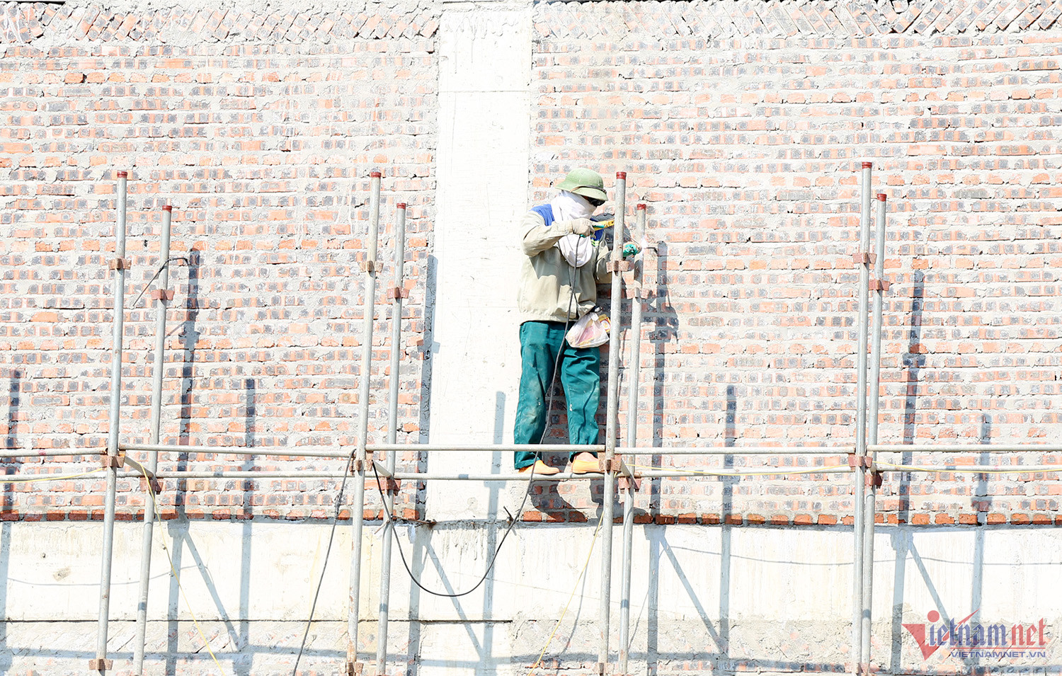 Gần trưa, nhóm thợ xây vẫn miệt mài phơi mình dưới cái nắng 36 – 39 độ. Một chiếc áo công nhân dài tay, khăn bịt kín khuôn mặt với chiếc nón lá vẫn không đủ để chống chọi với cái nắng cháy da.