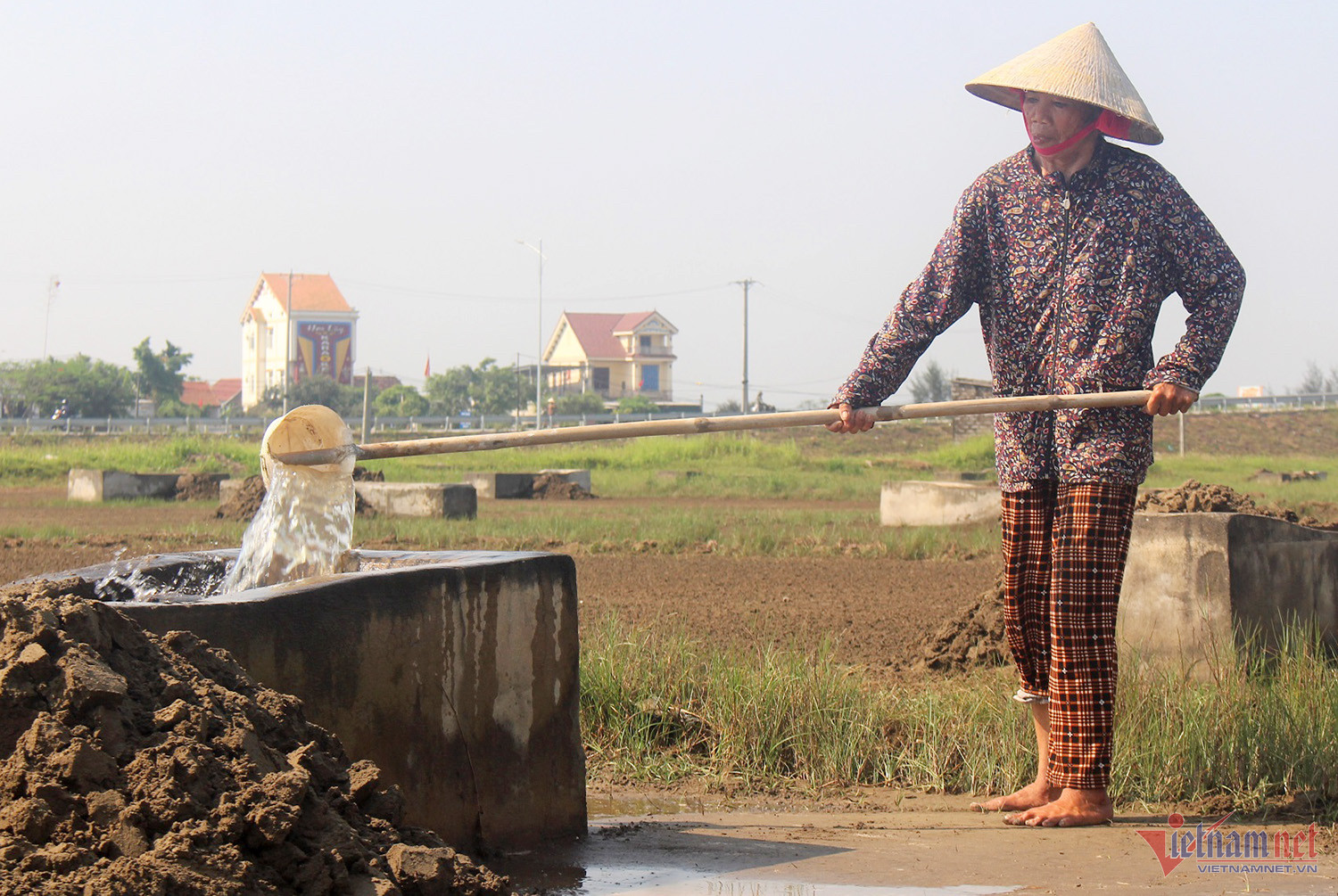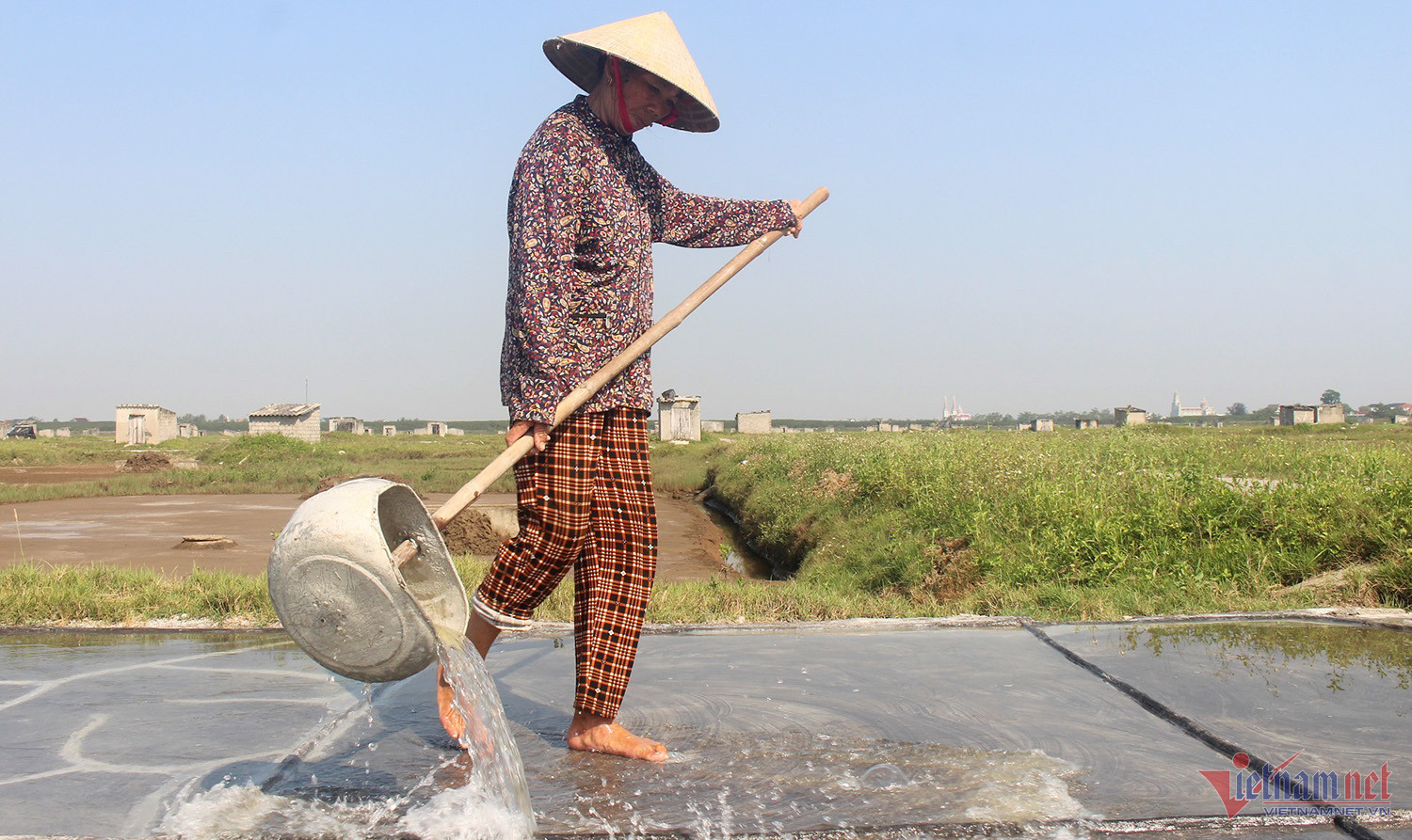 Múc nước tráng đều ruộng, chị Hồ Thị Xuân (41 tuổi, trú xã An Hoà) cho hay, nghề muối vất vả, cực nhọc, giá muối lại quá thấp, phơi mình dưới nắng gắt, vắt kiệt mồ hôi để làm muối.
