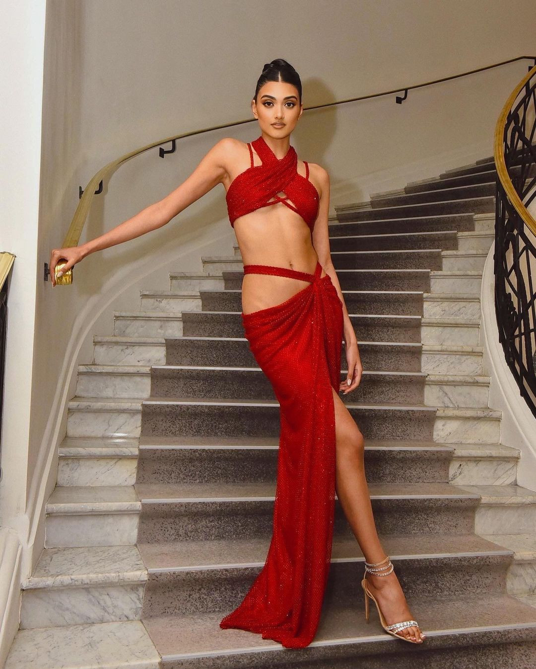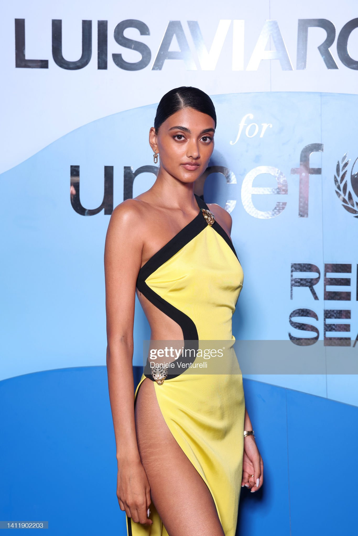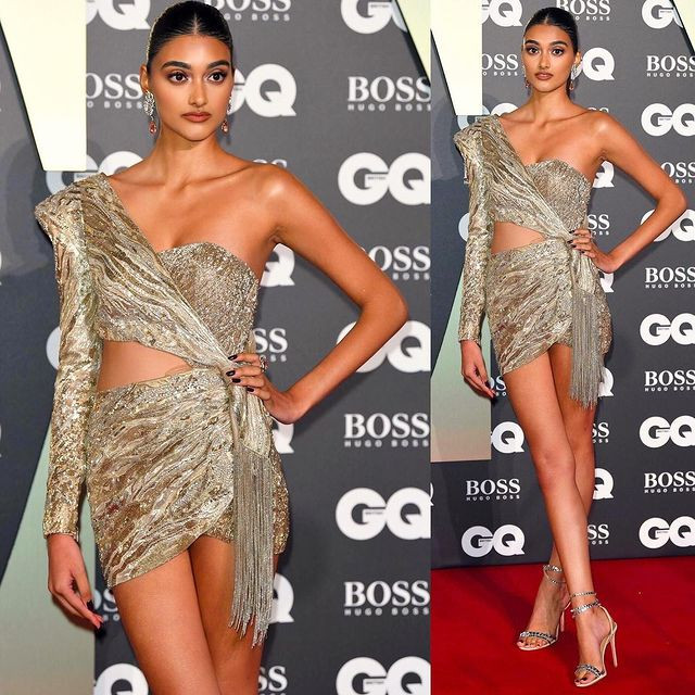 Siêu mẫu người Anh chọn chiếc đầm vàng nổi bật siêu sexy tới sự kiện với những đường viền đen bắt mắt kết hợp sandal quai mảnh thời thượng. Trang phục táo bạo khiến Neelam Gill tạo dáng hướng nào cũng tạo khoảng hở trước ống kính.