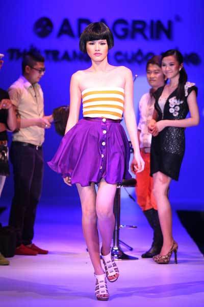 Chiếc áo tím của người mẫu Kim Minh bỗng chốc biến thành…váy của Tuyết Lan.