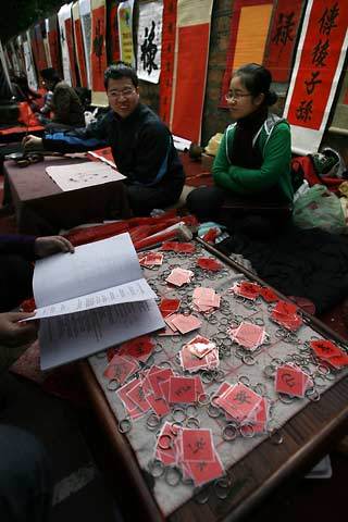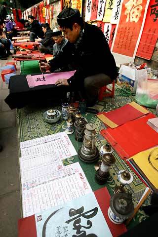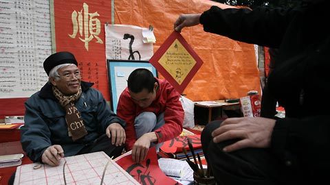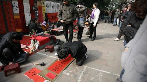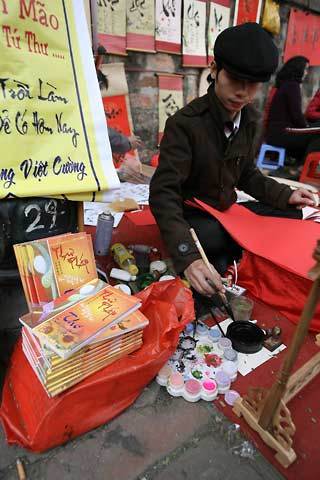 ![]() Cứ mỗi độ tết đến, xuân về dọc bờ tường Quốc Tử Giám lại xuất hiện trên dưới trăm ông đồ cho chữ. ![]() Chữ thời nay không chỉ có giấy đỏ mà được viết trên rất nhiều chất liệu giấy khác nhau tùy sở thích khách hàng và các ông đồ chỉ lấy tiền giấy còn chữ thì cho không. ![]() |