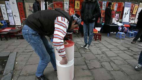 | Những ông đồ trẻ đang chuyển đến những cuộn giấy nặng hàng chục kg. |