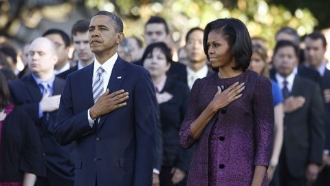 | Tổng thống Mỹ Barack Obama và vợ Michelle Obama cúi đầu mặc niệm các nạn nhân vụ khủng bố 11/9/2001. (Ảnh: Reuters) |