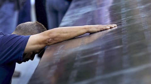 | Anh Joe Torres quỳ gối trước đài tưởng niệm nạn nhân vụ 11/9. Một trong