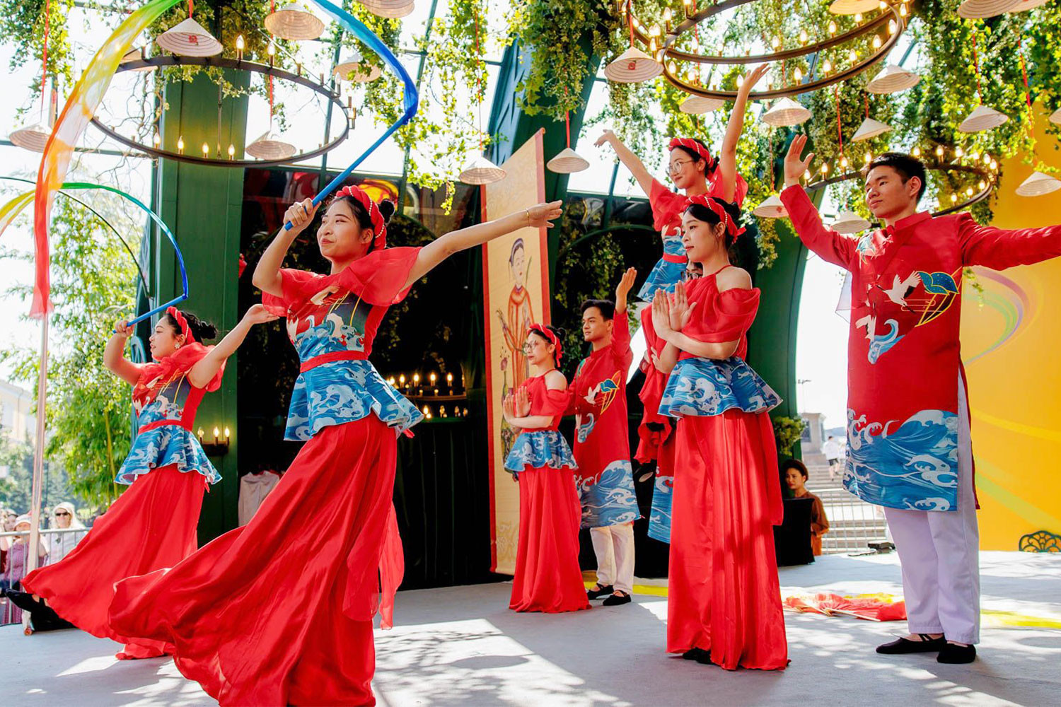 Tất cả du khách đều được mời thưởng thức nhiều món ăn đặc sắc. Trong đó, những món bán chạy nhất gồm có phở bò, bánh bao và cà phê Việt. Về hàng thủ công truyền thống, nón lá với họa tiết trang trí sinh động và tranh Đông Hồ được ưa chuộng đặc biệt.