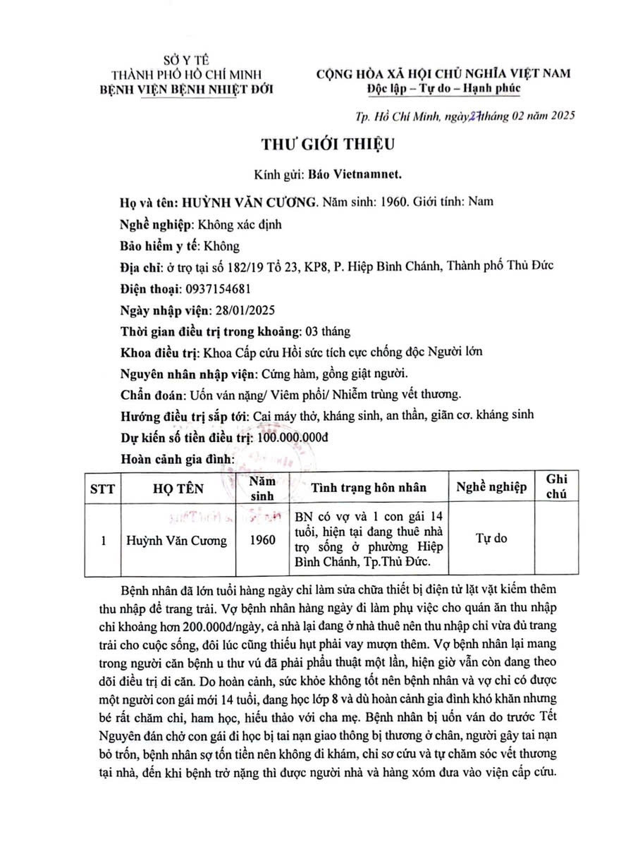 Sau khi biết được hoàn cảnh tội nghiệp của gia đình, Bệnh viện Bệnh nhiệt đới TP.HCM đã liên hệ đến Báo VietNamNet. Mong rằng thông qua nhịp cầu nhân ái này, họ sẽ gặp được những tấm lòng thơm thảo, giúp đủ viện phí để điều trị bệnh.