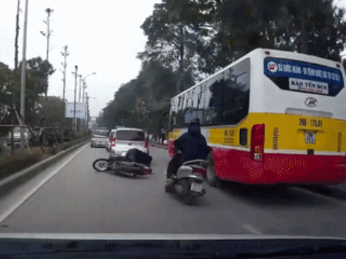 Ngay lập tức, người này dùng tay bám vào xe buýt, chân trượt theo xe vài bước mới dừng lại. Tại hiện trường, nhiều đồ đạc trong cốp xe Lead bật tung ra, người và xe nằm sõng soài giữa đường.