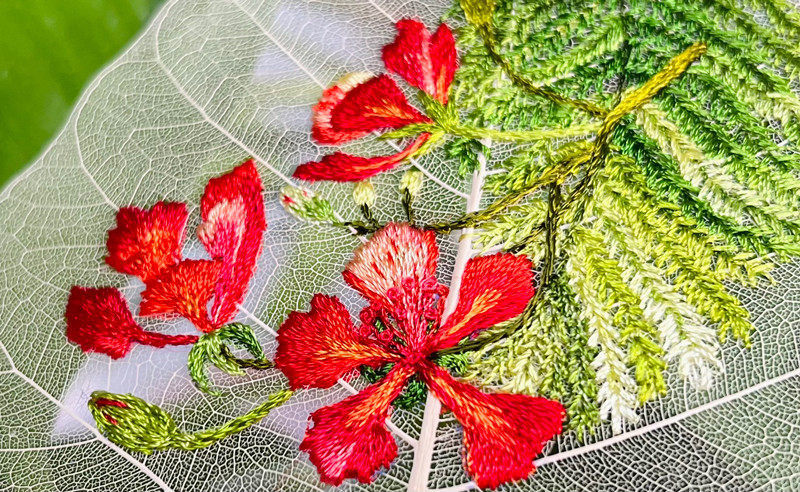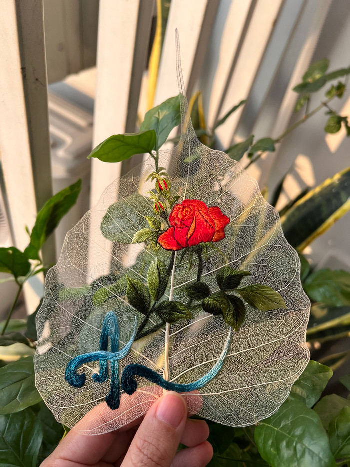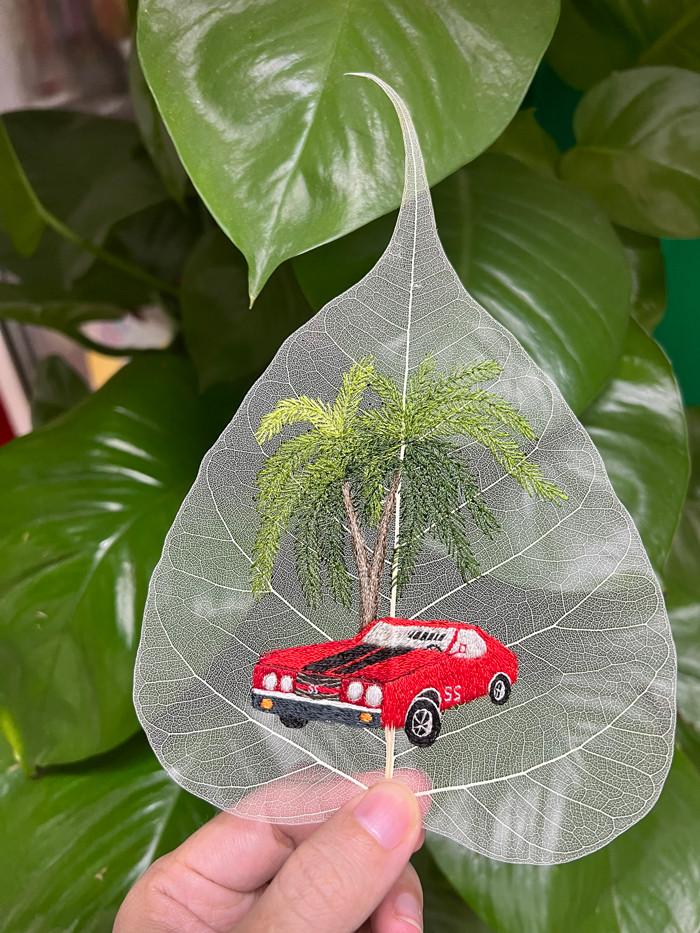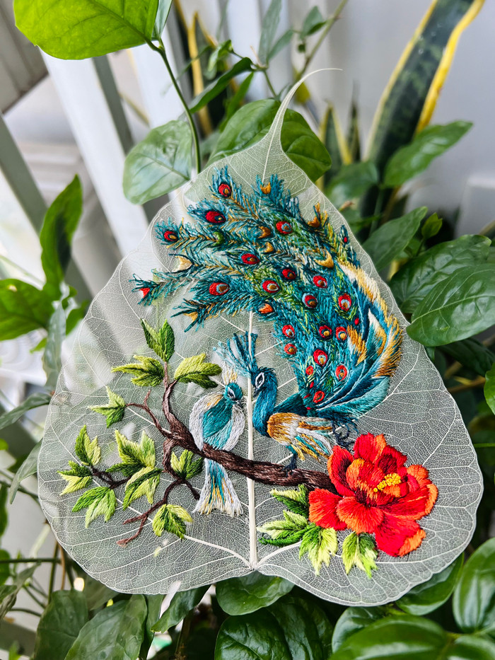 Duyên thêu tay 3D trên xương lá bồ đề đến với chị Cúc thật tình cờ khi có một học viên nhờ chị chỉ cách. Bản thân chị cũng muốn nghiên cứu sâu hơn về nghệ thuật thêu 3D, sáng tạo họa tiết tinh xảo hơn trên các chất liệu khó thay vì thêu trên vải thông thường. Và rồi chị quyết định thử sức với xương lá bồ đề.