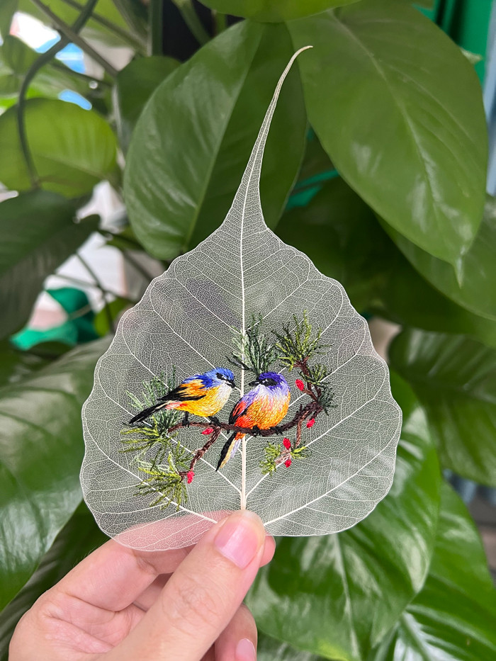 Nói về lý do chọn lá bồ đề làm chất liệu để thêu tranh 3D, chị Cúc chia sẻ: “Mình chọn lá bồ đề vì độ bền cũng như hình dáng bắt mắt của lá. Chiếc lá bồ đề còn chứa đựng ý nghĩa lớn, mang giá trị cuộc sống. Mình muốn thổi hồn, hồi sinh cho lá, mong lá sống lại với một hình ảnh mới mẻ hơn".