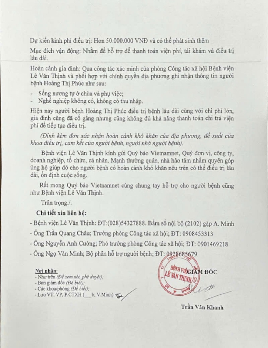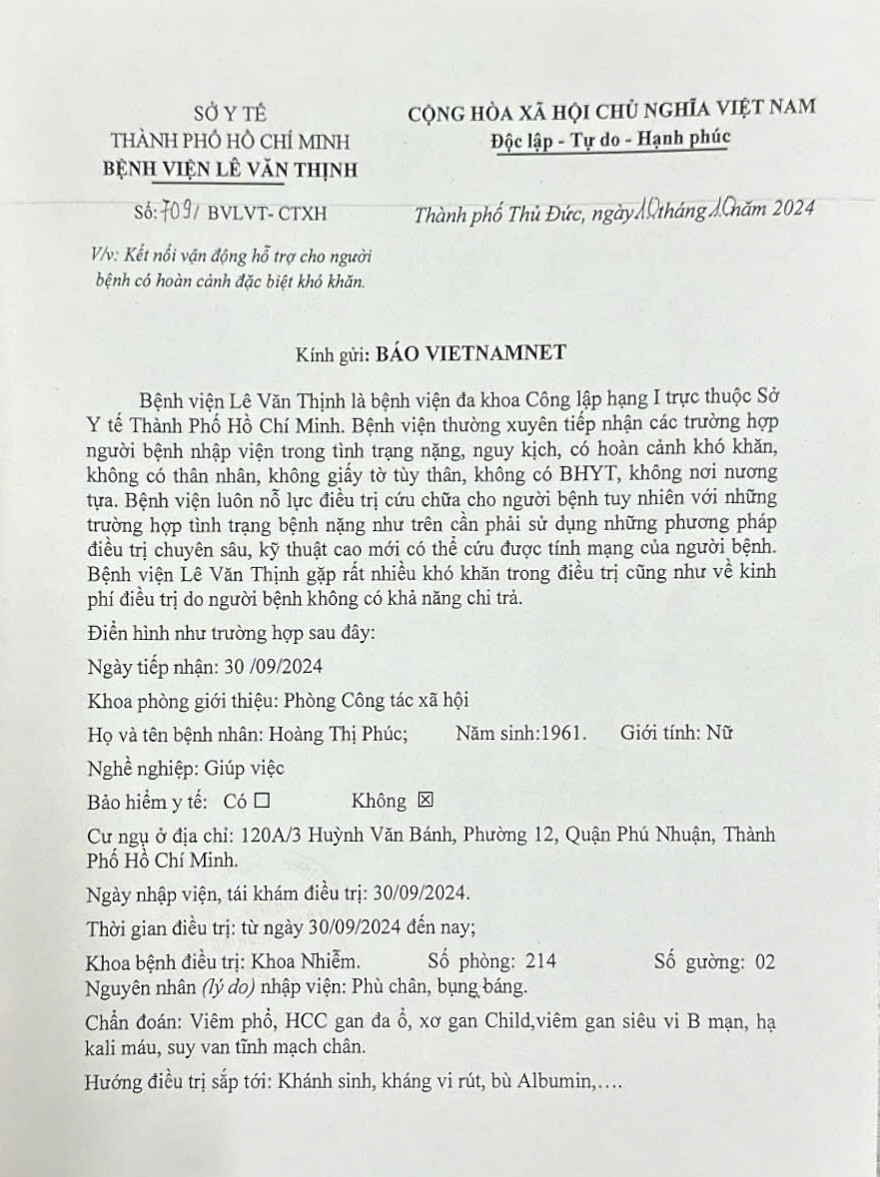 Mọi sự giúp đỡ xin gửi về: 1. Gửi trực tiếp: Phòng công tác xã hội Bệnh viện Lê Văn Thịnh hoặc bà Hoàng Thị Phúc; Địa chỉ bệnh viện: 130 Đường Lê Văn Thịnh, Phường Bình Trưng Tây, Thành phố Thủ Đức, TP. Hồ Chí Minh; SĐT: 0833019114. 2. Ủng hộ qua Báo VietNamNet: Ghi rõ ủng hộ MS 2024.290 (Bà Hoàng Thị Phúc) Chuyển khoản: Báo VIETNAMNET Số tài khoản: 0011002643148. Sở giao dịch Ngân hàng Ngoại Thương Việt Nam - 198 Trần Quang Khải, Hà Nội - Chuyển khoản từ nước ngoài: Bank account: Báo VIETNAMNET - The currency of bank account: 0011002643148 - Bank:- BANK FOR FOREIGN TRADE OF VIETNAM - Address: 198 Tran Quang Khai, Hanoi,Vietnam - SWIFT code: BFTVVNV X - Qua TK ngân hàng Vietinbank: Chuyển khoản: Báo VietNamNet Số tài khoản: 114000161718 Ngân hàng TMCP Công Thương Việt Nam - Chi nhánh Đống Đa - Chuyển tiền từ nước ngoài: Vietnam Joint Stock Commercial Bank for Industry and Trade, Dong Da Branch - Address: 183 Nguyễn Lương Bằng, quận Đống Đa, Hà Nội - Swift code: ICBVVNVX126 3. Hoặc trực tiếp báo VietNamNet: - Phía Bắc: Địa chỉ: tầng 3, tòa nhà C’Land,156 Xã Đàn 2, phường Nam Đồng, quận Đống Đa, Hà Nội. - Phía Nam: Văn phòng đại diện báo VietNamNet phía Nam, số 27 Nguyễn Bỉnh Khiêm, Quận 1, TP.HCM. Điện thoại: 19001081. |