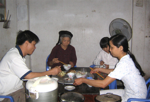 | Bà Thăng bên bữa cơm cùng con cháu. Ảnh: Trần Đức Hạnh. |