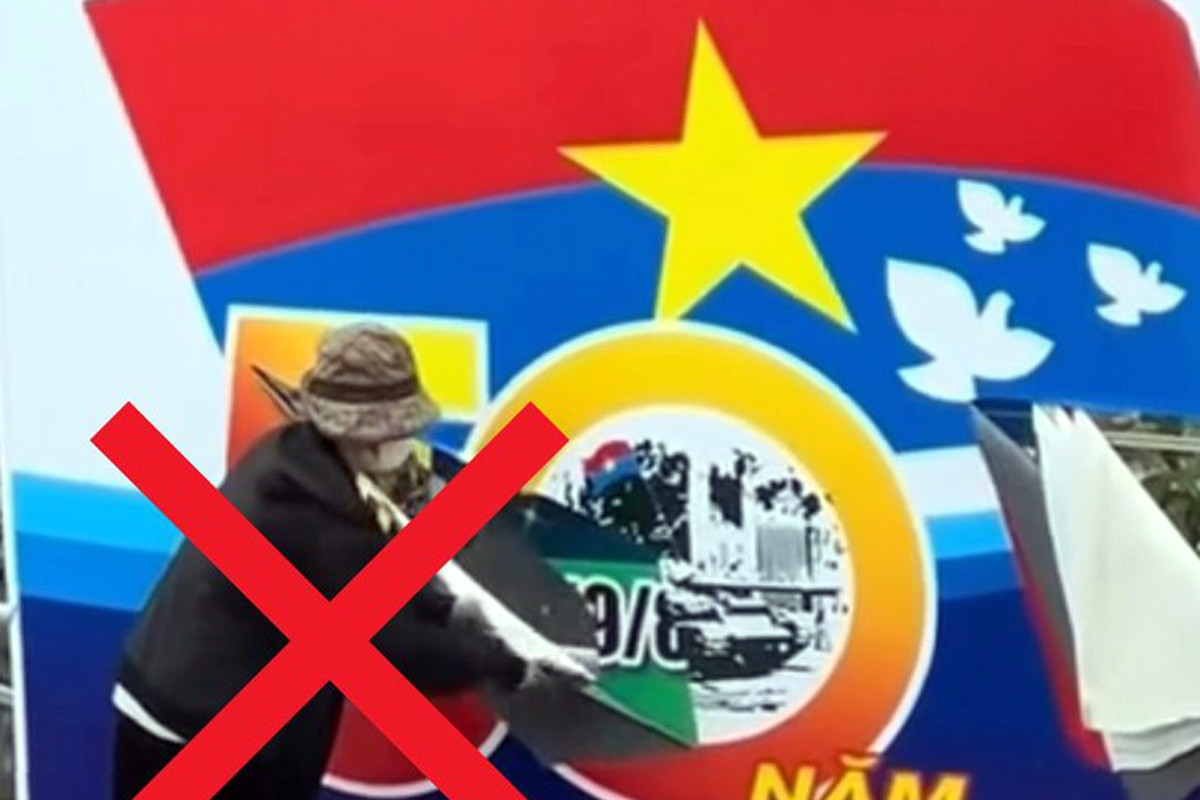 Cùng ngày, trên mạng xã hội lan truyền đoạn clip ghi lại cảnh một người phụ nữ đội mũ, mặc áo chống nắng, đeo khẩu trang kín mặt, dùng dao rạch tấm pa nô chào mừng 50 năm ngày thống nhất đất nước, được đặt tại vỉa hè khu vực Cầu Mới, phường Thượng Đình.