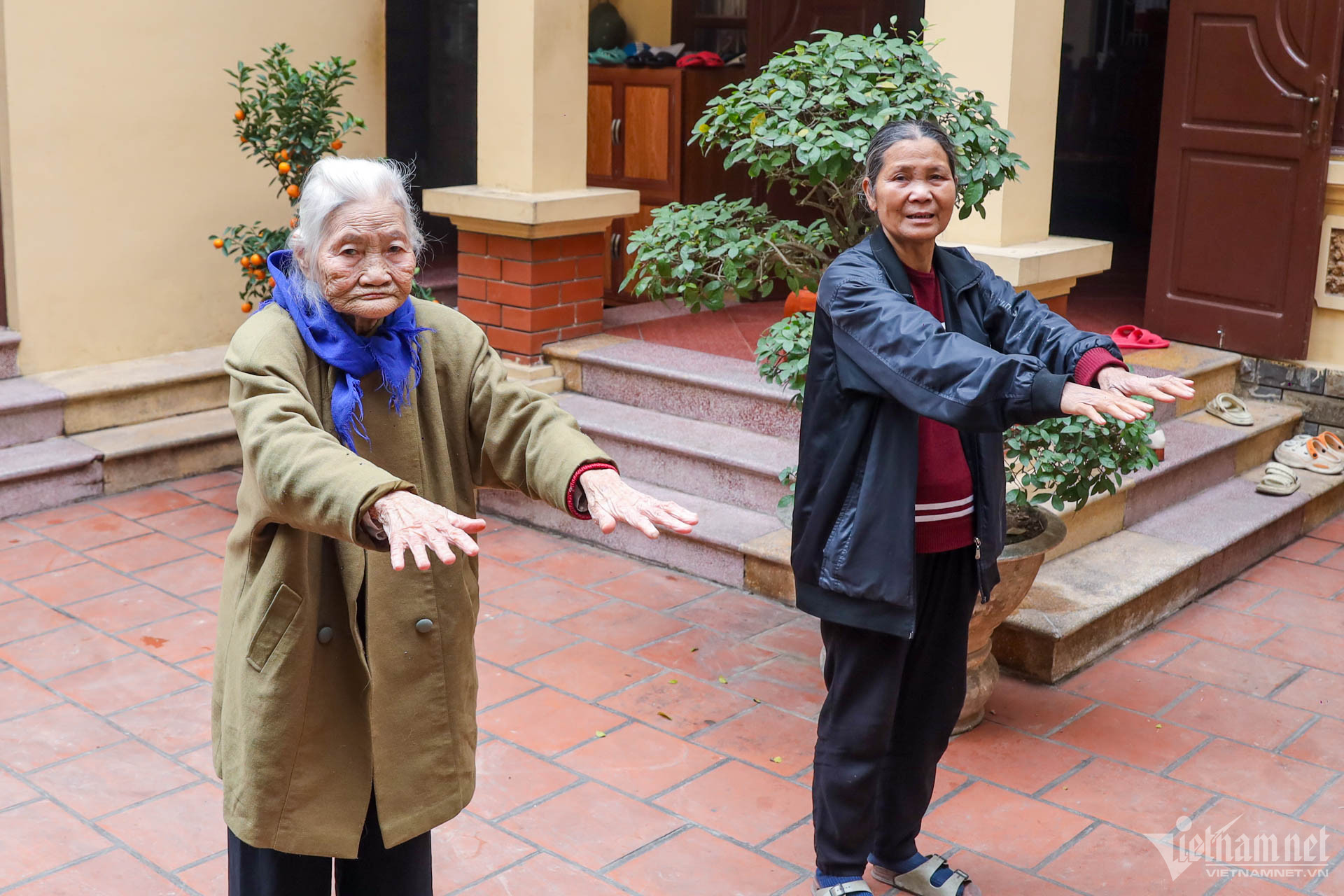 Người phụ nữ đã bước qua tuổi 101 vẫn tập thể dục cùng con dâu, rèn luyện vận động mỗi ngày. Ảnh: Chí Hiếu
