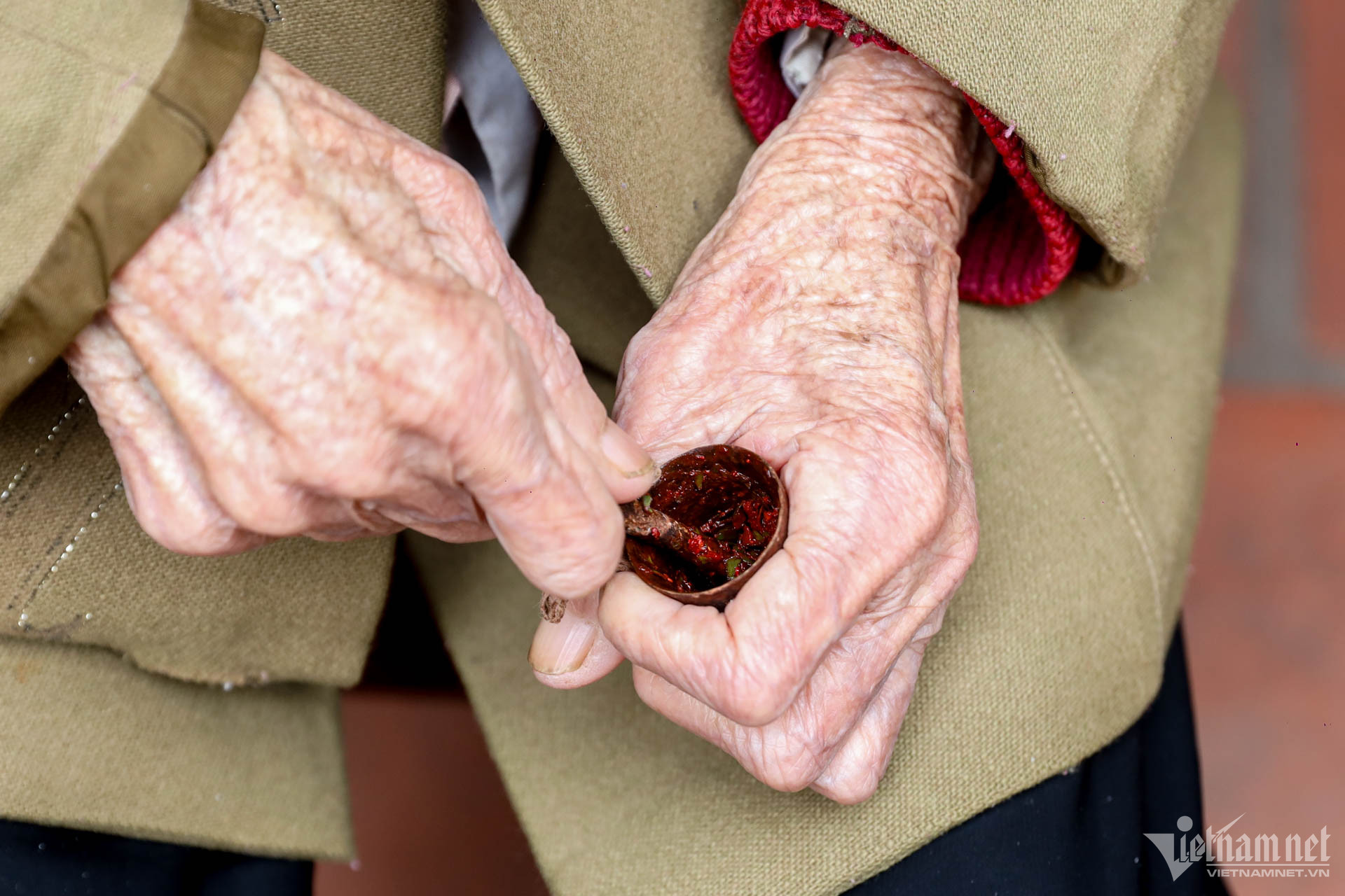 Sáng tháng 3, trời Hà Nội hửng nắng sau chuỗi ngày giá rét, cụ Đỗ Thị Tít trở mình, quàng thêm tấm áo dạ. Người phụ nữ vừa bước qua tuổi 100 cầm chiếc cối giã trầu, nhẹ nhàng bước ra bậc thềm nhà.