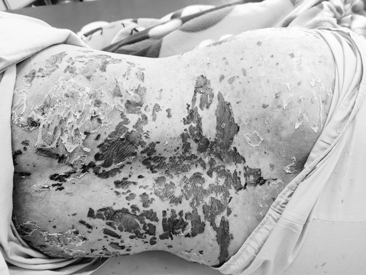 Bệnh nhân N.T.H. (49 tuổi), ở huyện Cẩm Thủy, Thanh Hóa, nhập viện vào ngày 22/1 (mùng 1 Tết Quý Mão) trong tình trạng mệt mỏi, tiếp xúc kém, sốt cao liên tục, loét, chảy máu vùng miệng, loét bộ phận sinh dục, đỏ da toàn thân, trớt da đến 80% diện tích cơ thể.