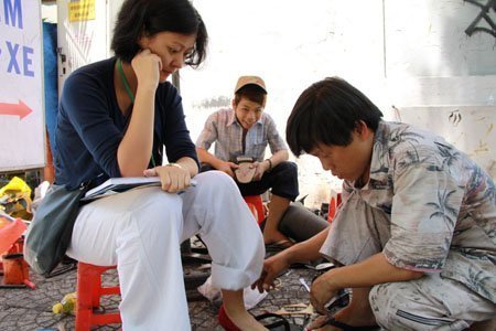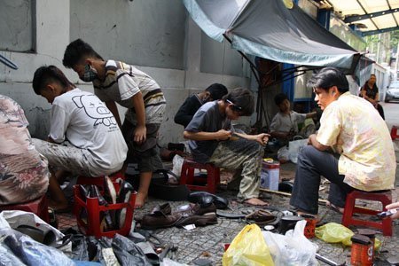 Buổi trưa hè oi nồng, chỉ lác đác vài chiếc xe phóng vội trên đường Lê Thánh Tôn, nhưng chỗ sửa giày của anh Văn vẫn có gần chục khách đứng đợi. Những cà mèn cơm dùng buổi trưa nguội dần, nhưng cả nhóm thợ vẫn mải mê làm việc vì khách liên tục ghé đến khiến buổi trò chuyện của chúng tôi với nhóm thợ thường bị ngắt quãng.