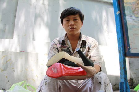 Vừa tiếp chuyện anh Văn vừa cầm chiếc giày thể thao địa hình để sửa chữa lại những chỗ bị rách. Chiếc giày hàng hiệu sờ vào cứng như đá nhưng đối với Văn không có gì là khó, đôi tay người đàn ông hơn 40 tuổi này cứ thoăn thoắt cầm mũi dùi đều đặn ấn xuống rồi kéo lên từng sợi chỉ để khâu lại chỉ trong tích tắc.