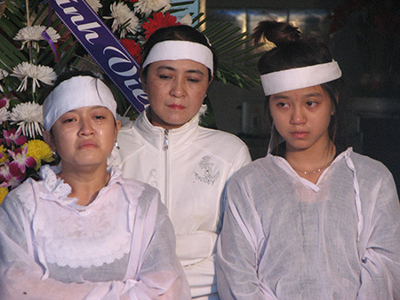 Bà Liễu (giữa) và 2 con tại lễ tang ông Hùng