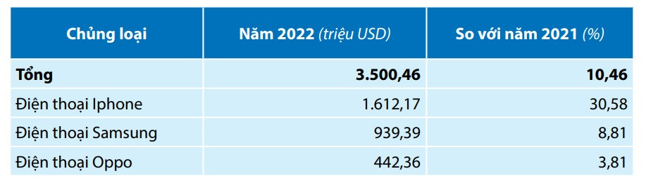 Cụ thể, giá trị nhập khẩu điện thoại iPhone là 1,61 tỷ USD (tăng tới 30,58% so với năm 2021), điện thoại Samsung là 939 triệu USD, điện thoại Oppo là 442 triệu USD.