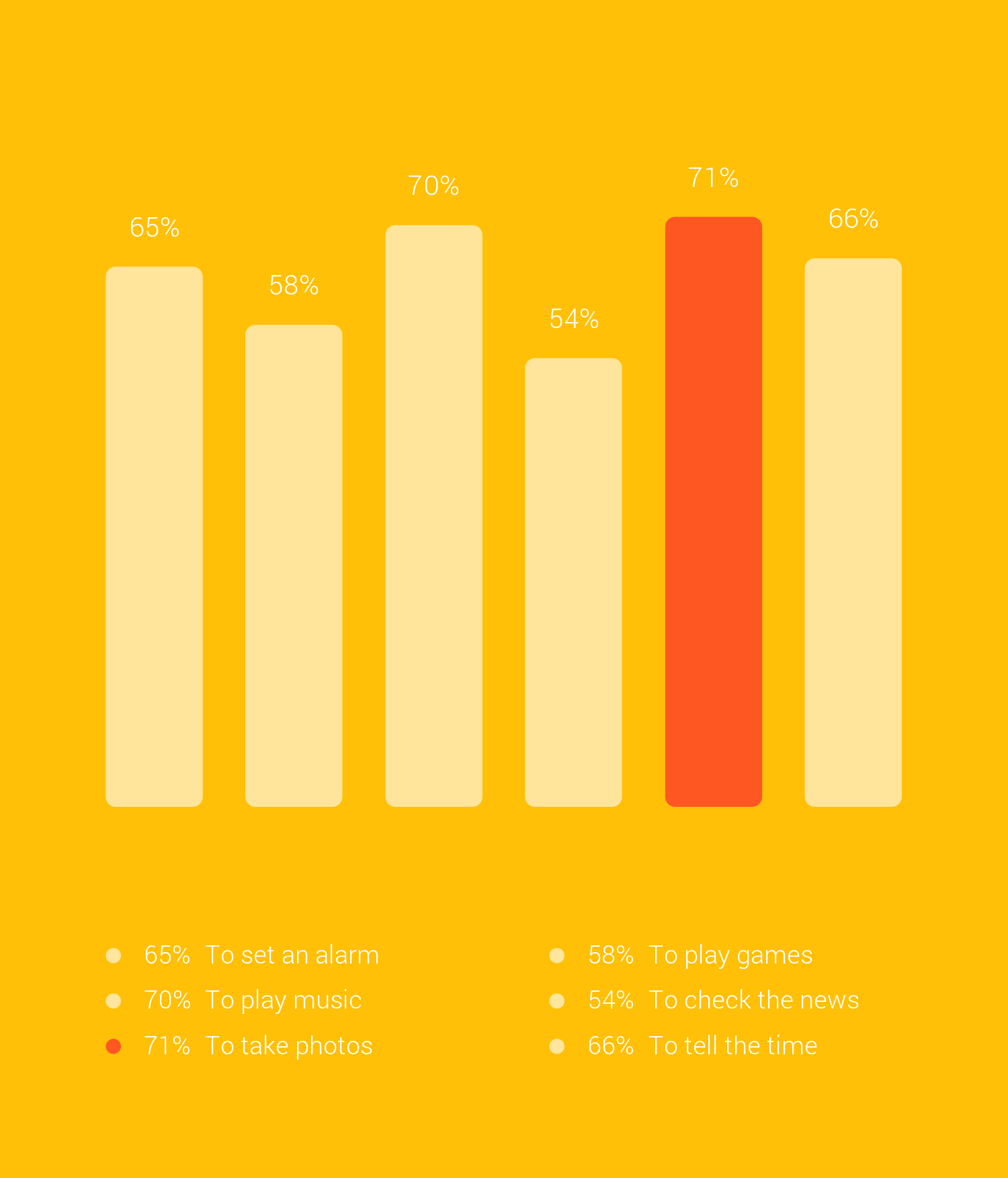 Với người dùng Việt, smartphone được phát huy tác dụng thường xuyên khi chụp ảnh (71%), nghe nhạc (70%), xem giờ (66%), báo thức (65%). Đáng chú ý, Việt Nam đứng thứ hai thế giới về tý lệ khảo sát mua sắm qua smartphone (30%), chỉ sau Hàn Quốc (43%), trong đó bảo hiểm xe hơi (75%), tivi (71%), phim ảnh (68%) là các loại sản phẩm được nghiên cứu nhiều nhất.