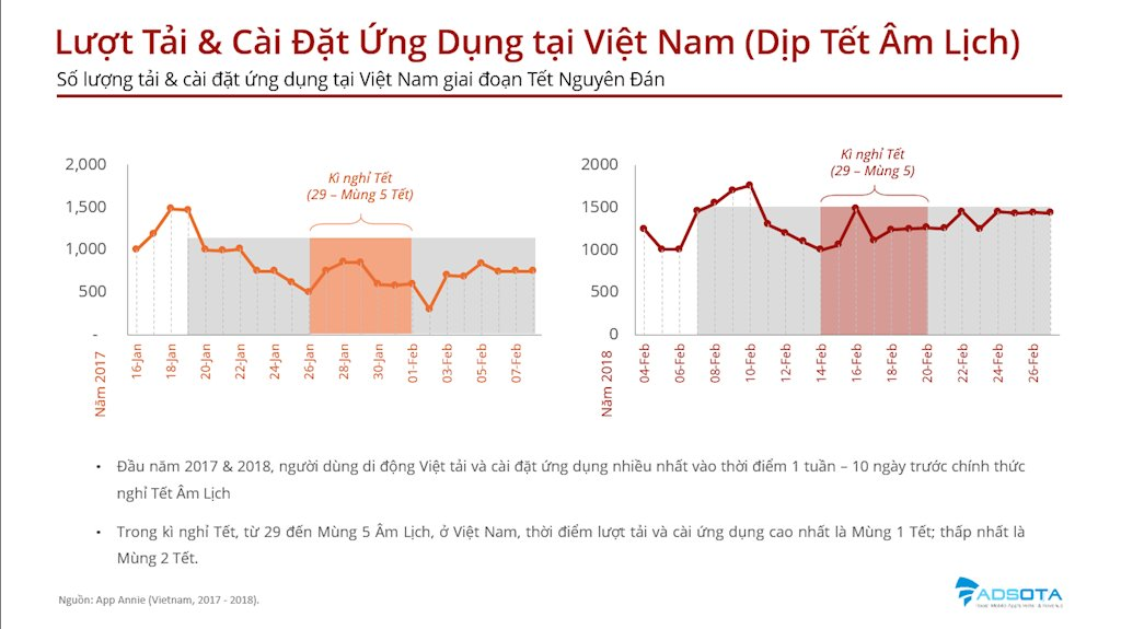 Theo báo cáo của Adsota, trong giai đoạn 1 tháng trước, trong và sau Tết, xu hướng cho thấy, một tuần trước khi kỳ nghỉ bắt đầu, lượt tải ứng dụng di động đạt ngưỡng cao nhất. Cụ thể, trong kỳ nghỉ lễ chính thức từ 29 đến mùng 6 Âm Lịch, mùng 1 Tết dường như là ngày mà người dùng Việt “khai xuân” bằng việc tải ứng dụng về di động của mình. Tuy nhiên, chỉ ngay khi bước sang ngày Mùng 2 Tết, con số này lại giảm tới gần 35%.