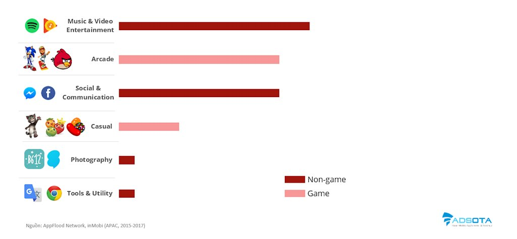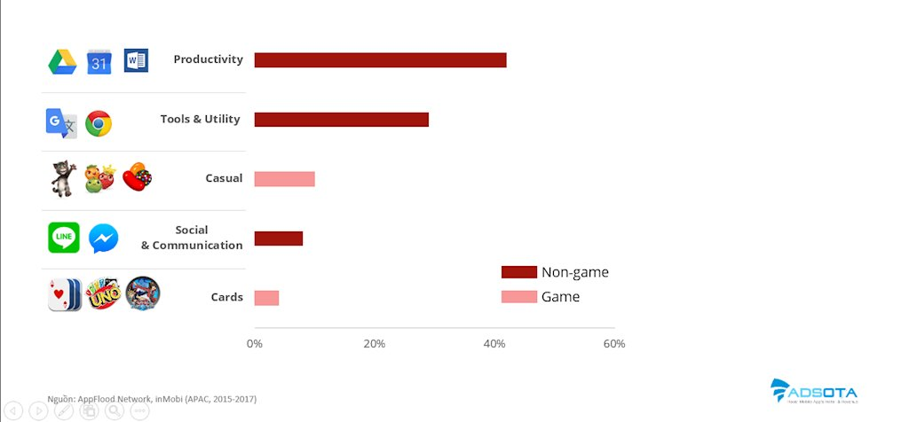 Về các ứng dụng thuộc danh mục Game, dễ hiểu khi những trò chơi mang tính casual (game Phổ thông) hay Game bài lại được người dùng trong khu vực chú ý đến nhiều nhất. Lý giải cho điều đó, có nhiều quốc gia châu Á đông dân và có xu hướng yêu thích những tựa game này như Trung Quốc, Indonesia hay ngay cả Việt Nam.