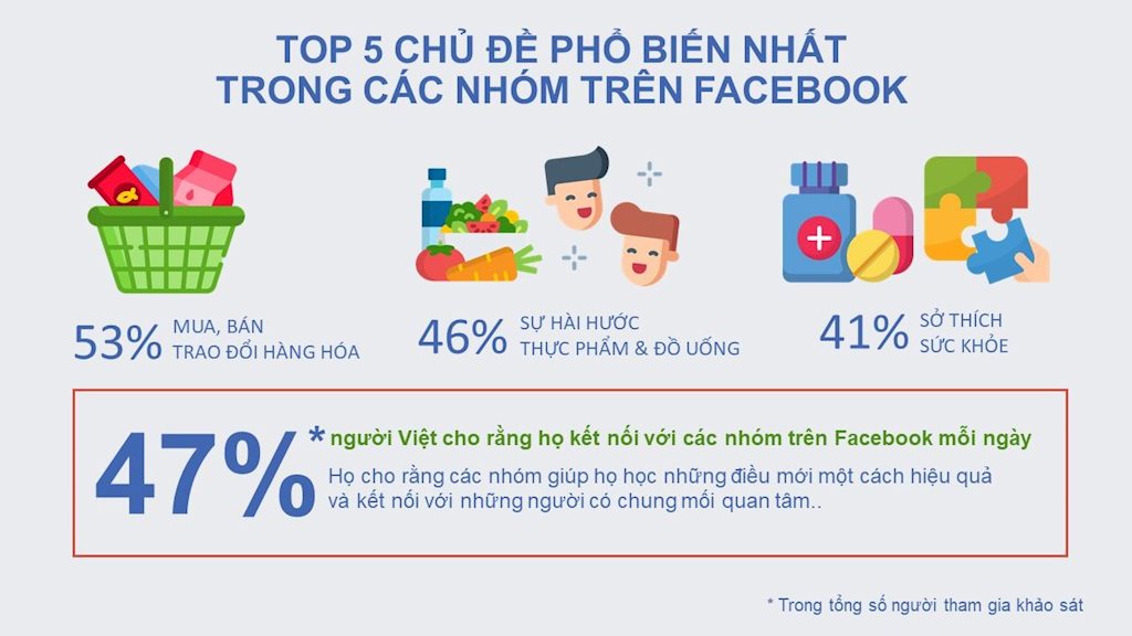 Facebook đã hợp tác với YouGov để cùng thực hiện một khảo sát trên 941 người dùng về các Nhóm trên Facebook (Facebook Groups) tại Việt Nam. Kết quả cho thấy người Việt sử dụng Nhóm để tìm kiếm ý nghĩa, sự hỗ trợ và kết nối với những người có chung sở thích hay mục đích. Gần một nửa (47%) số người tham gia cho rằng họ kết nối với Nhóm trên Facebook của mình hàng ngày.