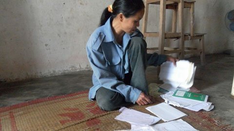| Chị Nguyễn Thị Phú bên đống giấy tờ bệnh tật của con mình |
