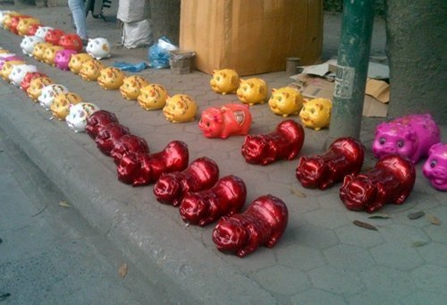 Thời gian gần đây tại Hà Nội, trước cổng nhiều công viên, hay tại một số vỉa hè trên đường Phạm Văn Đồng, Tô Hiệu, Nghĩa Tân, đường Láng… xuất hiện nhiều quán bày bán những con lợn đất tiết kiệm, to nhỏ đủ cỡ. Màu sắc của lợn đất vô cùng bắt mặt: từ xanh, đỏ, vàng, trắng…
