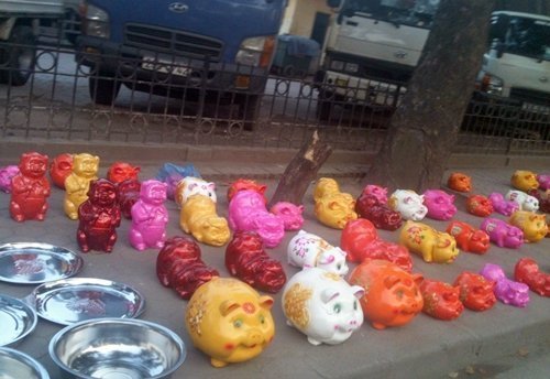 | Lợn đất đủ màu sắc được bày bán trên vỉa hè |