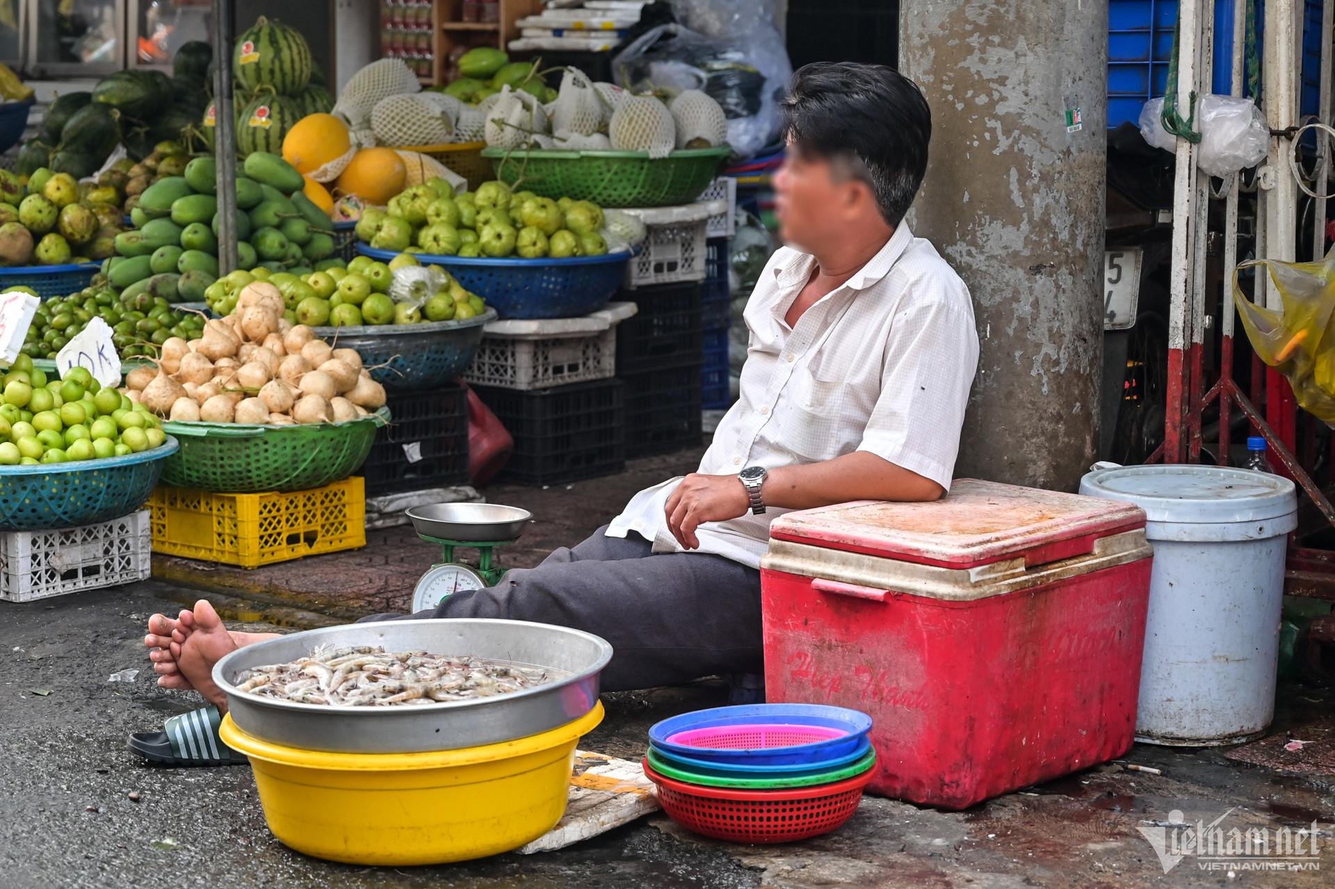 Hải sản phải bảo quản trong tủ đông với điều kiện nhiệt độ ổn định mới bảo đảm an toàn nhưng được người bán bày luôn trên thùng xốp, thau nhôm. Nhiệt độ ngoài trời nóng bức lại thêm mùi tanh khiến nhiều ruồi, nhặng bay vờn hoặc đậu lên cá, mực...