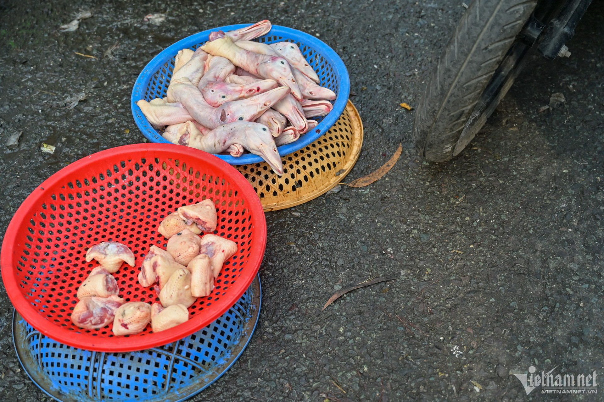 Một số tiểu thương bày bán hàng ngay trên nắp cống thoát nước. Mùi hôi tanh của nước thải từ việc giết mổ bốc lên nồng nặc.