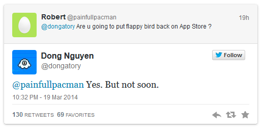 Hôm 19/3, đáp lại câu hỏi của một game thủ trên Twitter về việc có định đưa “Flappy Bird” về App Store của Apple hay không, Đông trả lời: “Có. Nhưng không sớm”. Một câu nói khá “mập mờ” song cũng đủ để người chơi “Flappy Bird” ngóng trông vào ngày đoàn tụ với chú chim có cặp mỏ “vĩ đại”.