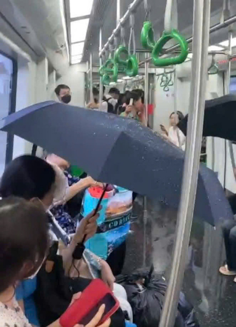Theo phản ánh của hành khách trên chuyến tàu metro Cát Linh - Hà Đông vào khoảng 17h45 - 17h50, nước từ hệ thống điều hòa tại một toa tàu bất ngờ chảy tong tong từ trần xuống. Một số hành khách phải che ô để tránh nước chảy vào người.