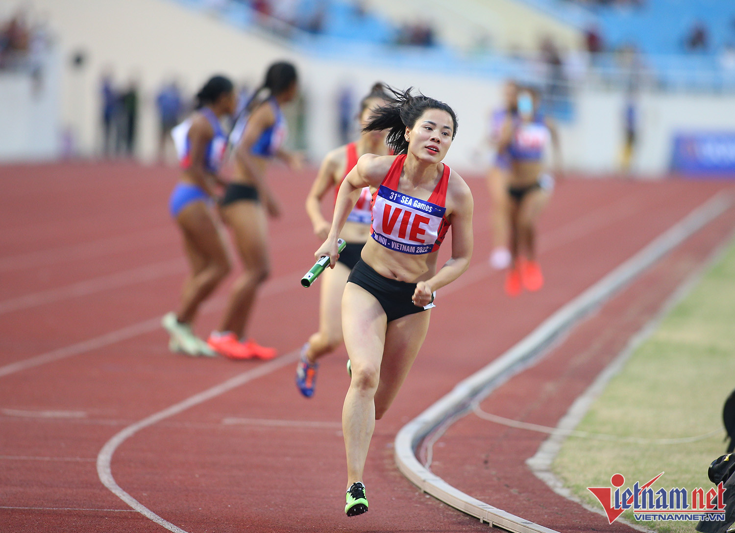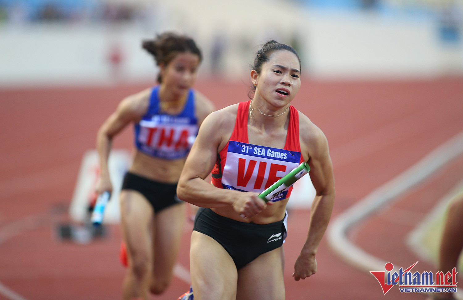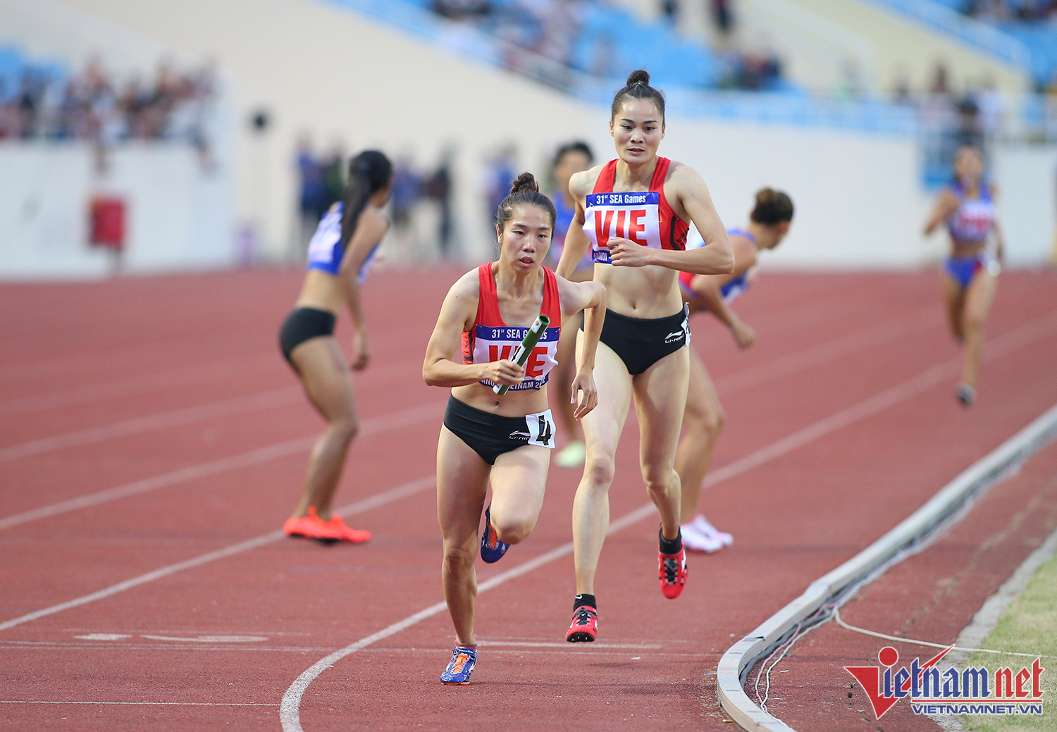 Tiếp sức 4x400m nữ là nội dung mà đội nữ Việt Nam là đương kim vô địch SEA Games. Vì thế, khi được thi đấu trên sân nhà, các VĐV Việt Nam thi đấu rất quyết tâm để bảo vệ ngôi hậu. Hoàng Thị Ngọc chính là người lĩnh ấn tiên phong cho đội chủ nhàQuách Thị Lan là VĐV thứ 2Cô gái người Thanh Hóa tiếp tục giúp chủ nhà Việt Nam dẫn đầu trước hai đội Thái Lan và PhilippinesRất đông người hâm mộ tới sân Mỹ Đình cổ vũ cho đội tuyển điền kinh Việt NamQuách Thị Lan trao gậy cho Nguyễn Thị Hằng Người chạy cuối cùng ở nội dung tiếp sức 4x400m là Nguyễn Thị HuyềnBà mẹ một con một mình băng về đích với thông số 3 phút 37 giây 99Cô gái người Nam Định bế con gái cùng các đồng đội ăn mừng tấm HCVĐây là tấm HCV thứ 10 trong sự nghiệp của Nguyễn Thị HuyềnỞ tuổi 29, Nguyễn Thị Huyền vẫn rất bền bỉTuyển điền kinh vượt chỉ tiêu đề ra sau mà tỏa sáng của Nguyễn Thị Huyền và các đồng đội